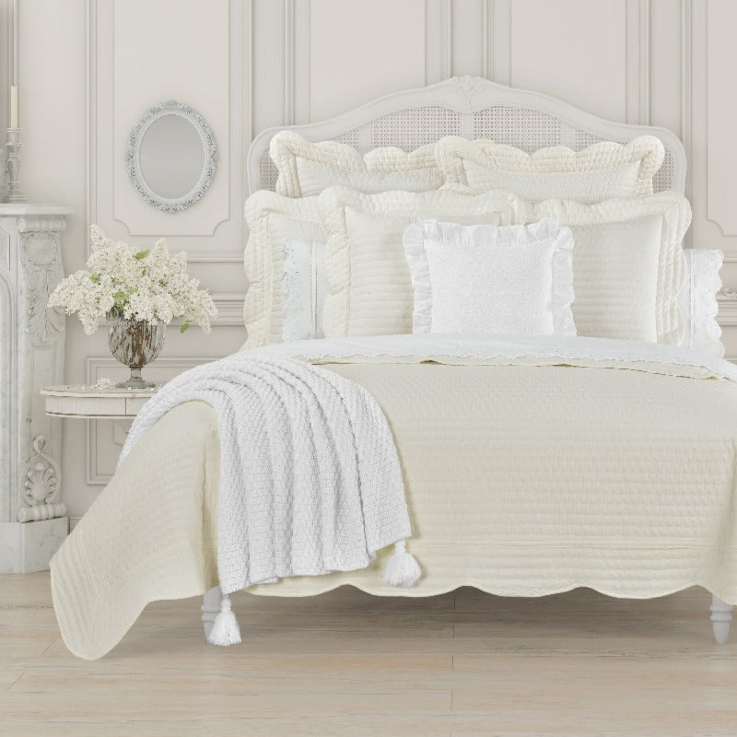 Frame your bed with the relaxed scalloped border of the Amherst. Featuring a timeless Farmhouse style with a 5” scallop trim on all four sides, with rounded corners for a beautiful drape look. Soft pre-washed cotton on both sides gives this lightweight layer an irresistibly smooth hand feel. Available in multiple color options to match your decor, a colored thread is used for the intricate channel quilt stitching, and the reverse fabric matches the border for a touch of color. Pair this Quilt with the Amherst Pillow shams, and it is easy to mix-and-match with Euro shams and throw pillows from the Piper & Wright collections to create your own unique look.