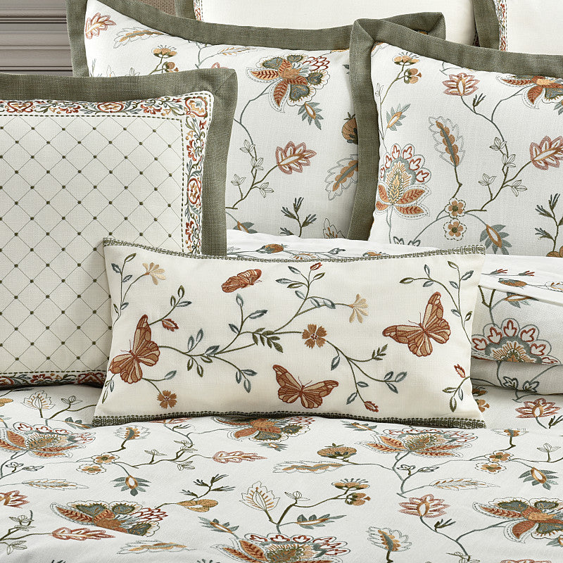 The Athena Boudoir Accent Pillow is constructed with a lovely butterfly and vine embroidery on a textured faux linen cream base cloth. Rust, sage, dark and light teal embroidered hues paired with accents of gold create a Fall harvest feel. The top and bottom of the boudoir are framed with a horizontal embroidered sage stripe. Pair this pillow with the Athena bedding set to complete the look.