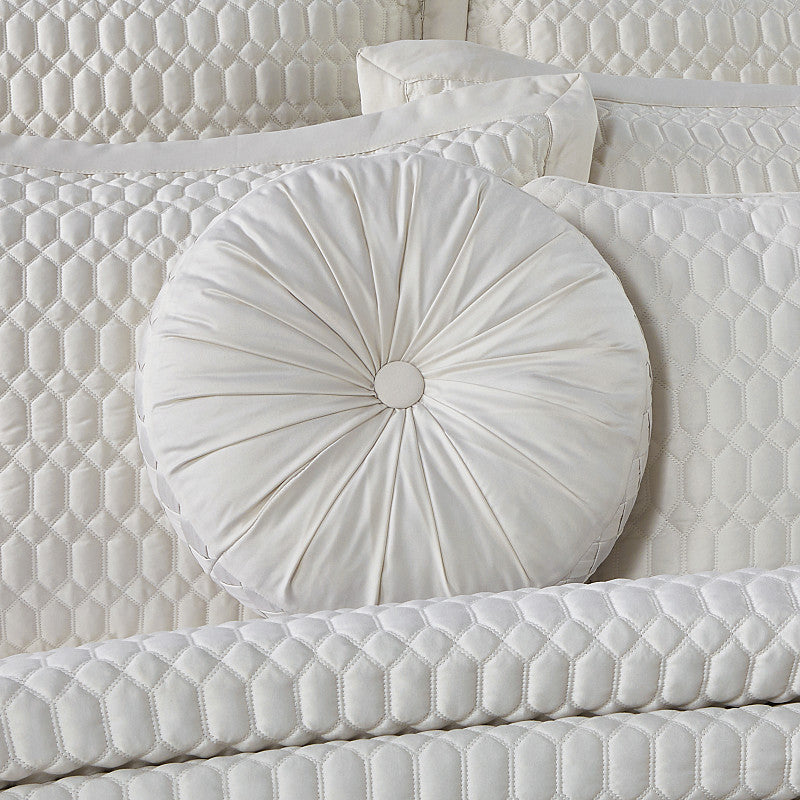 The Brilliance Tufted Round Pillow features a luxurious satin to create a one of a kind accent to this coverlet program. These unique pillows are sewn by hand with fabric covered buttons on both sides. Special craftsmanship include hand pleating and a basket weave gusset. Add the Brilliance Bedding collection to complete the look. Available in your choice of neutral color options.