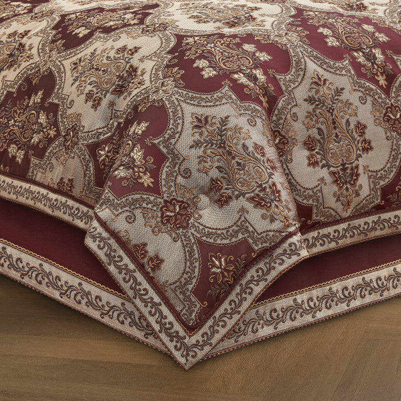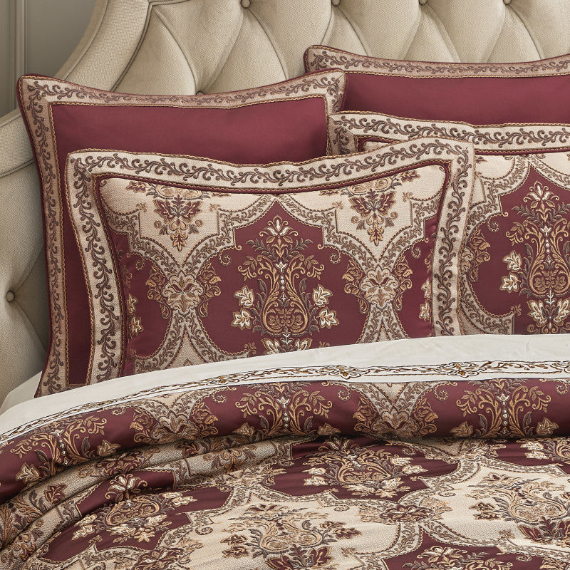 The Phyllis Comforter Set features a traditional woven damask in stunning shades of Bordeaux, chocolate and gold. The plush satin comforter is generously oversized and overfilled and finished with solid piping. Also included are 2 coordinate pillow shams, with a woven stripe split-corner bedskirt. Add the Phyllis accessories and window treatments to complete the look.