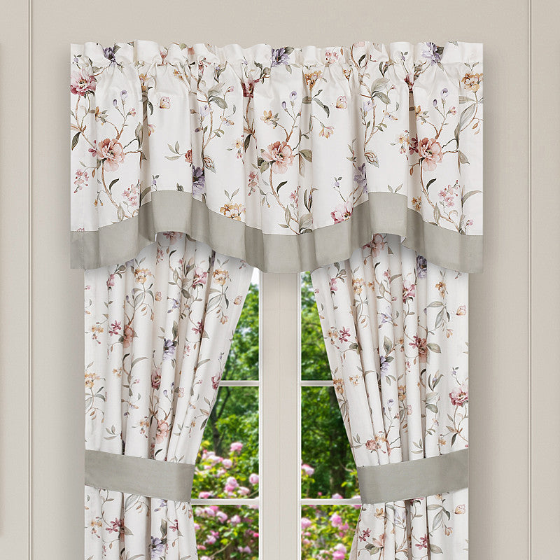 Complete your classic chic window decoration with Clarice Window Valance. It features a cream background adorned with a delicate floral pattern in shades of soft pink, coral, violet, and gold on a natural cotton fabric. The intricate design evokes a sense of classic sophistication, perfect for creating an inviting atmosphere. The scalloped valance is finished with a coordinate ivory trim on the hem. Add the Clarice window panels and bed set to complete the look.