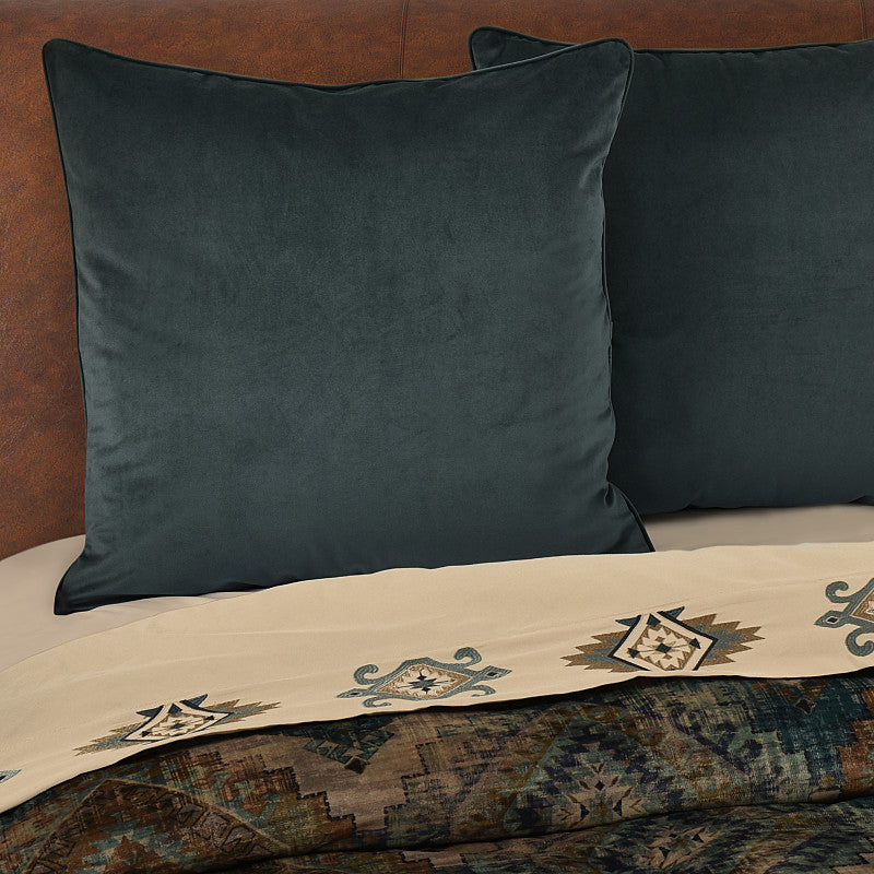 Transform your sleep space with the Southwest inspired Baja Euro Sham. Featuring a forest green velvet on the face and it reverses to a classic plaid design in teal, brown, forest green, and beige tones, making it a perfect blend of warmth and rustic elegance. Pair this pillow sham with the Baja window treatments and bedding ensemble to complete the look.