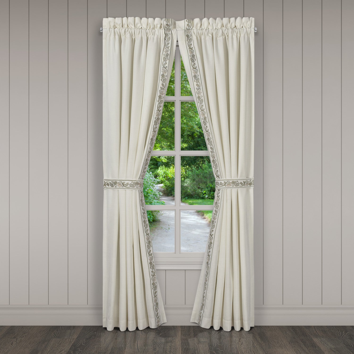 The Fairview Window Panel Pair showcases a simple yet elegant vertical leaf embroidery on a white textured fabric. Each panel is lined to keep your room shaded and comfortable and the weighted hems allow the panels to drape beautifully. The luxurious panels include matching embroidered tiebacks to complete the fresh open airy look. Pair these panels with the Fairview Window Valance and Bedding collection to complete your bedroom decor.