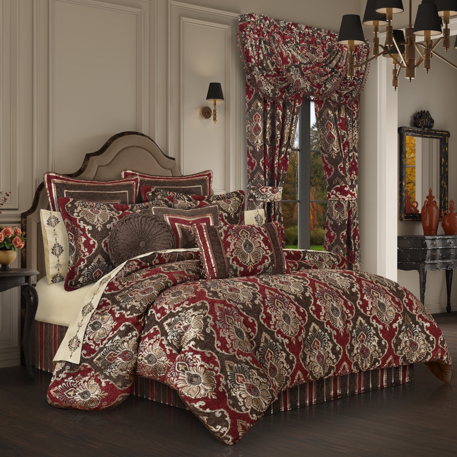 The Cerino Comforter Set features a traditional woven chenille damask, using an intricately designed pattern full of layered details. The deep rich chocolate, red, and gold colors in this bedding ensemble are a great accent to any bedroom. The comforter is generously oversized and overfilled and finished with a solid black velvet piping. The comforter includes two perfectly matched padded pillow shams with a hidden zipper closure and a bedskirt, with a complementing woven chenille stripe running vertically. Pair this bedding collection with the Cerino throw pillows, Euros, and window treatments to add luxury and opulence to your bedroom.