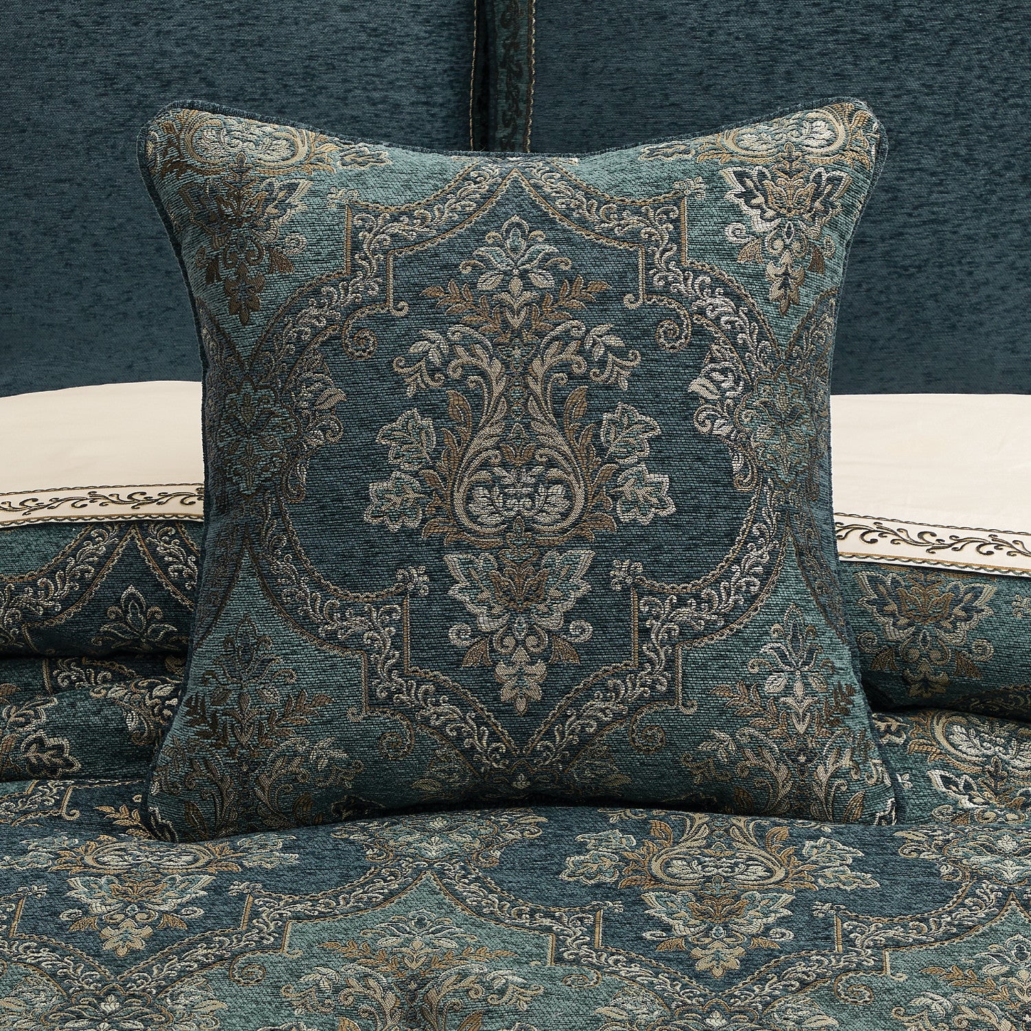 The Nancy 20 Inch Throw Pillow features a stunning woven damask design in a beautiful teal, green, and gold colorway. This lovely accent pillow is finished with a self-fabric cordage and was designed to coordinate with the Nancy Bedding collection.