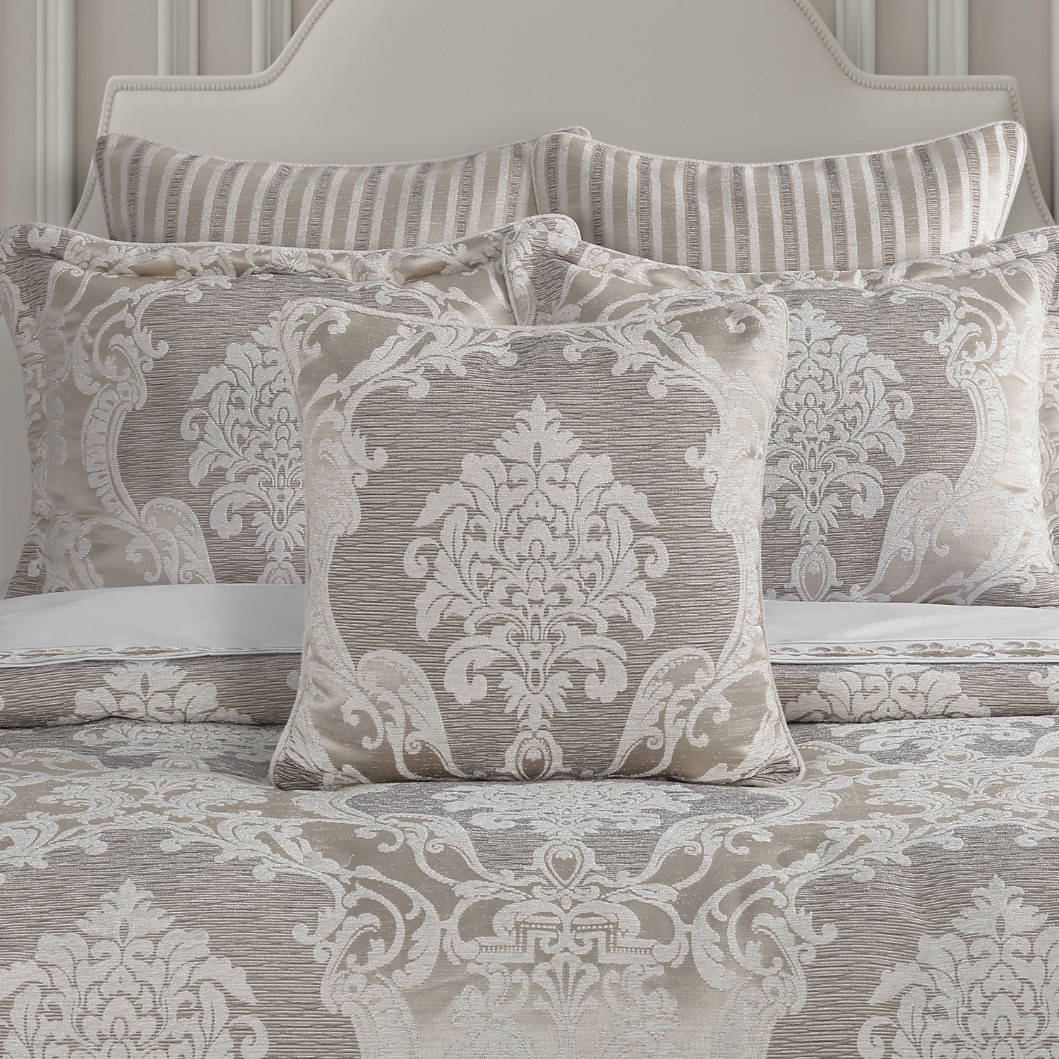 The Queensbury 20 Inch Throw Pillow features a grand-scale woven jacquard design in soft shades of almond and ivory. This luxury traditional accent pillow is finished with a self-fabric cord and was designed to coordinate with the Queensbury Bedding collection.