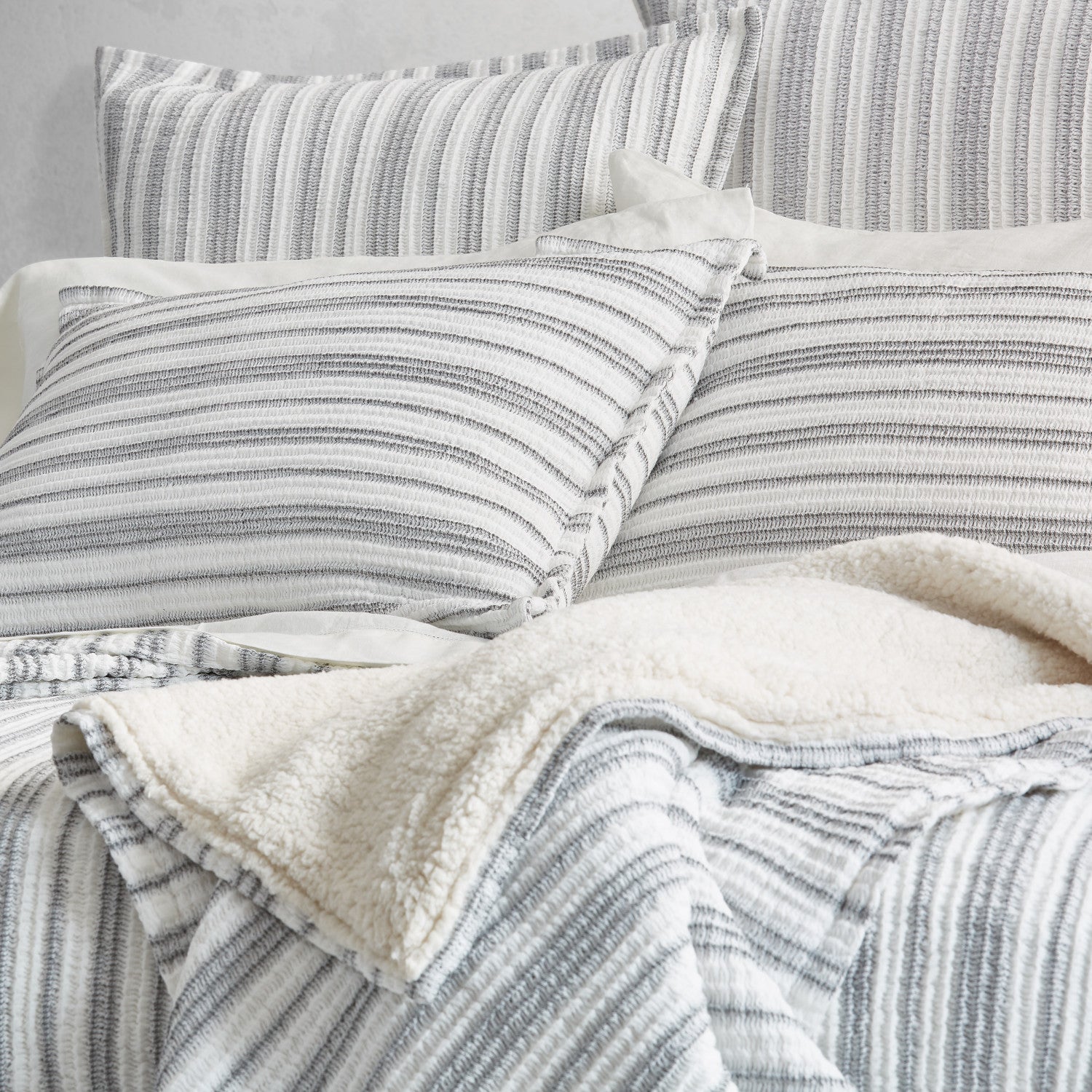 Crafted in Portugal from exceptionally fine 100% Cotton yarns, the Coachella Throw offers Malibu Beach House inspired indulgence and incredible comfort. Featuring a heavyweight construction, this plush throw blanket is uniquely woven with a soft crinkled textured in white and grey stripes with a warm Sherpa reverse. Add this stylish plush throw as a gorgeous neutral layer to your sofa or with the Coachella collection to complete the look.