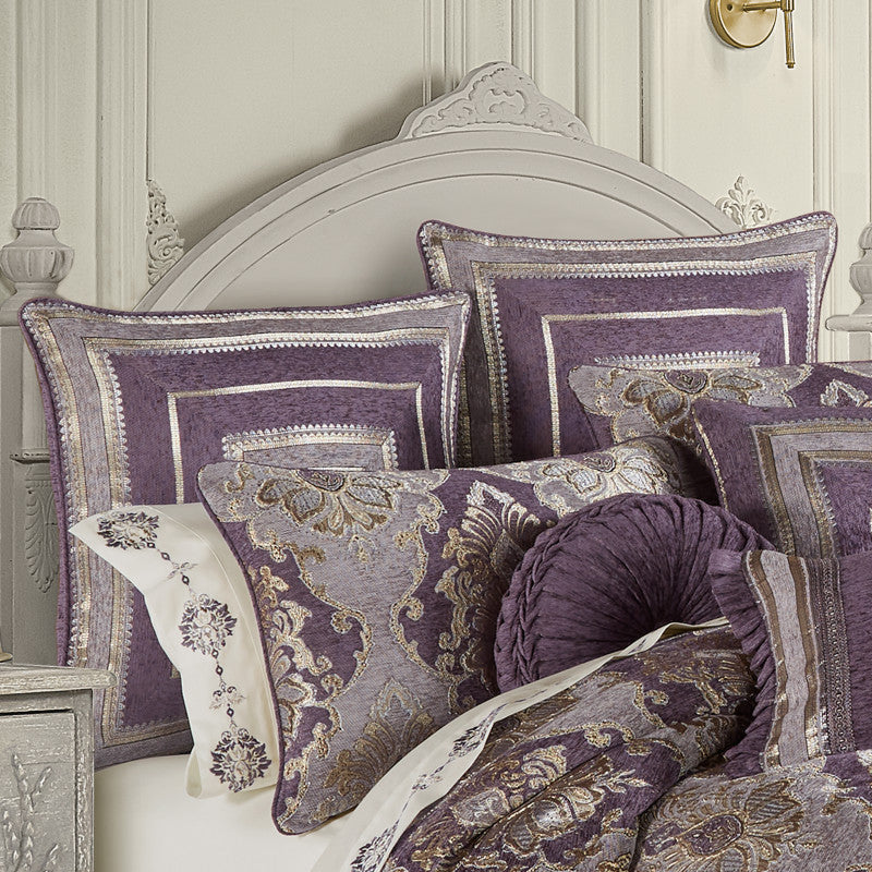 The Dominique Euro Sham is beautifully engineered with a traditional chenille jacquard mitered on the front. The reverse of this sophisticated pillow sham is a simple yet beautiful with a solid soft lavender chenille and hidden zipper closure. This 26" Euro Sham is the perfect backdrop to this traditional collection. Coordinates with the comforter set and accessories (each Euro sold separately).