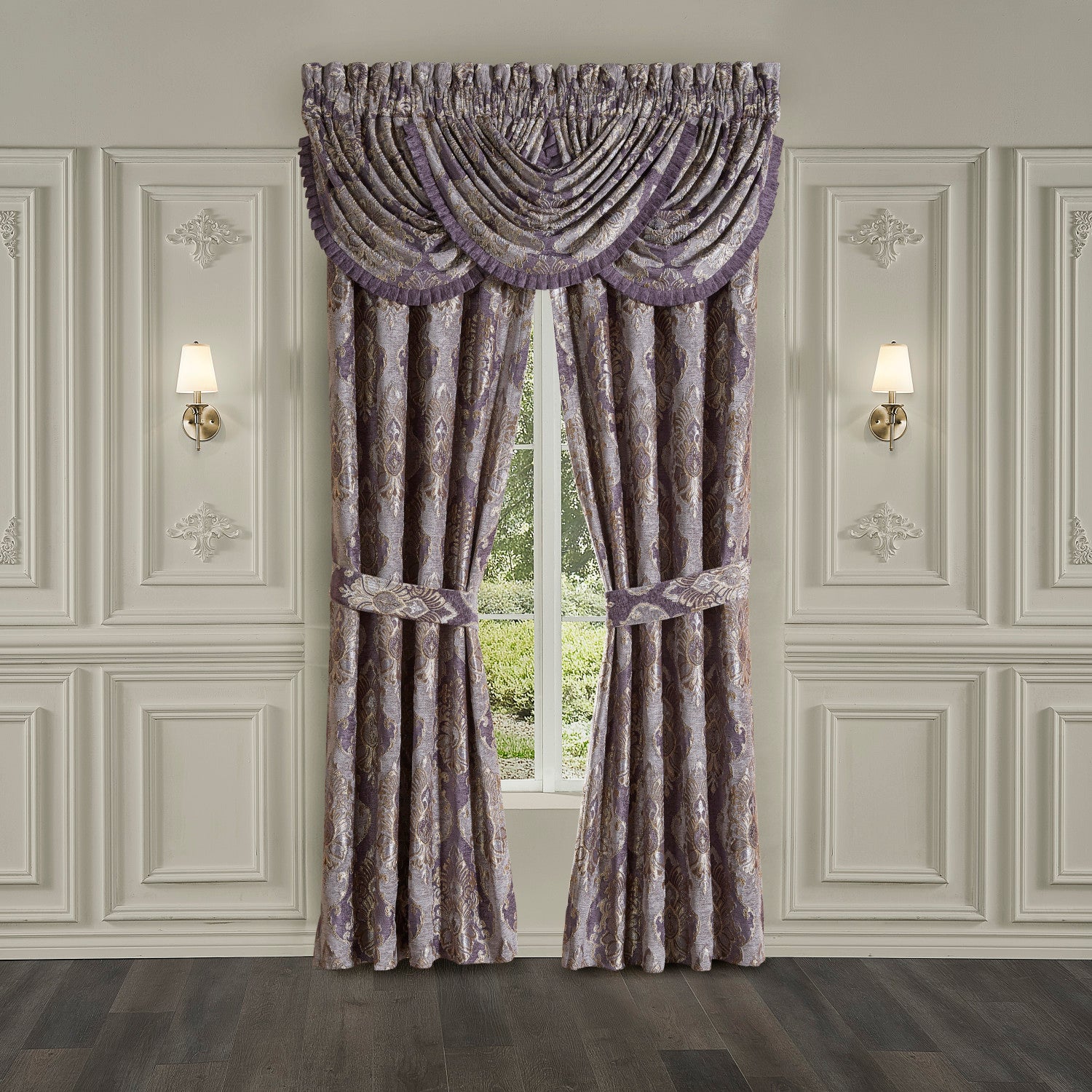 The Dominique Window Panel Pair is exquisite with its fine details and sophisticated use of gold and lavender. This beautiful woven jacquard damask is rich with its 3-dimensional weave and soft chenille finish. These lined panels include tiebacks, filter light for room darkening shade to keep you comfortable throughout the day. The 3" header and 3" rod pocket make these panels easy to hang for a perfect finishing touch to complete a traditional look to your decor.