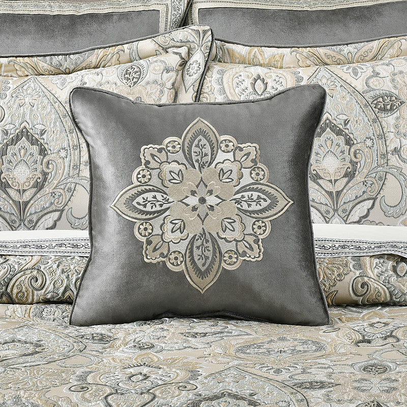 Traditional elegance and timeless colors inspire the Annabelle 18" Embellished Throw Pillow. It features a stunning silver velvet paired with an embroidered medallion design in spa blue and yellow-gold tones. A small velvet piping finishes the lofty throw pillow, which is recommended to add as the finishing touch to the Annabelle bedding set.