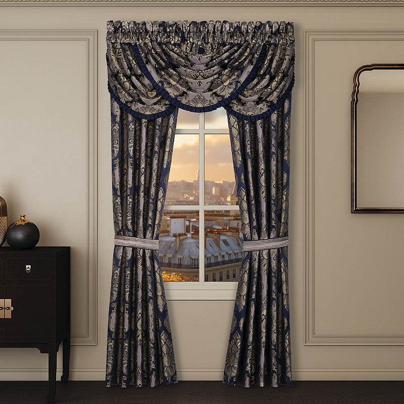 The Bradley Window Panel Pair is exquisite with its fine details and sophisticated use of navy blue and golden hues. The beautiful woven damask fabric features ornate details throughout creating layers of surface interest. These lined panels will keep your room cool and provide ideal room-darkening shade. They also include tiebacks to create an open airy look and the 3" header and 3" rod pocket make these panels easy to hang. Pair these panels with the Bradley bedding set for a complete look.