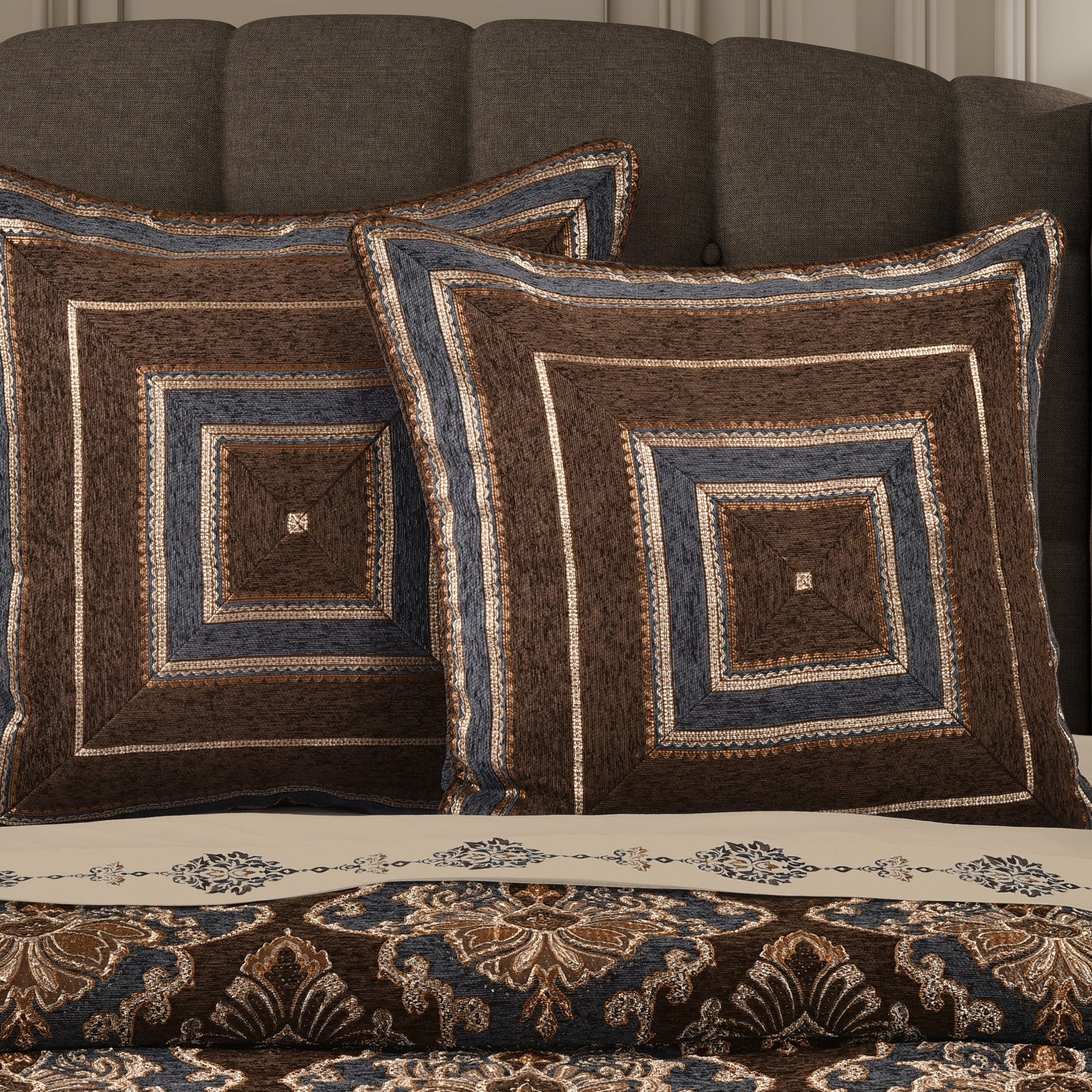 The Sofia Euro Sham is beautifully engineered with a traditional chenille stripe mitered on the front. The reverse of this sophisticated pillow sham is a simple yet beautiful with a solid soft blue chenille and hidden zipper closure. This 26" Euro Sham is the perfect backdrop and coordinates with the Sofia bedding collection (each Euro sold separately).