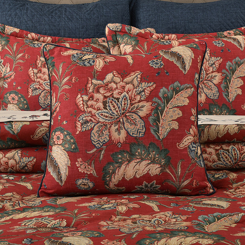 The Enchanted Garden 20” Square Decorative Throw Pillow is beautifully designed combining a fresh floral Jacobean with a indigo heathered solid reverse. Designed with shades of gold, blue, Indigo, pink and tones of green, highlighted on a lacquer red linen texture. Pair this designer accent pillow with the Enchanted Garden Bedding collection to complete the look.