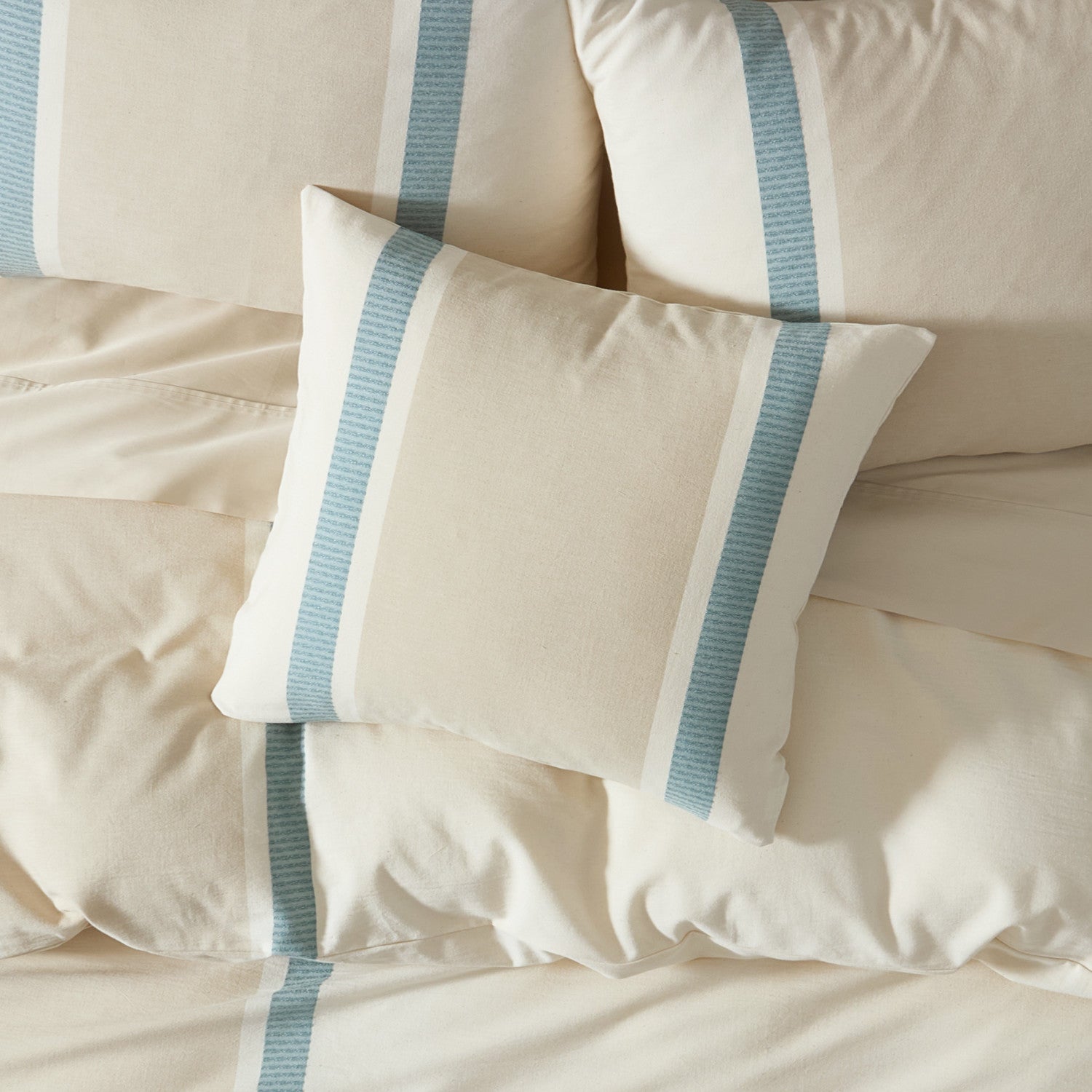 Crafted from exceptionally fine cotton yarns, the Breeze Throw Pillow Cover adds relaxed versatility and effortless layering to your décor. The unique cotton yarns are woven and tumbled to create a soft irresistible hand that becomes softer after every wash. The light teal, cream, and beige cabana stripes blend beautifully with the duvet set creating a serene sleep space. The cover features a hidden zipper closure for easy removal and washability (each sham sold separately). This lovely accent backdrop adds dimension and coordinates beautifully with the Breeze collection.