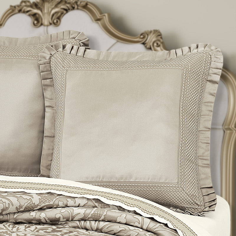 Classic elegance on a grand scale, the Brunello Euro Sham is tailored with a smooth satin center and bordered with an intricate jacquard band in gorgeous white and polished platinum tones. The surrounding edge is adorned with a satin pleated flange and reverses to a smooth solid fabric with a hidden zipper closure. Brunello designs are perfect for formal bedrooms, dining rooms, or anywhere that calls for a sophisticated, timeless look and it directly coordinates with the window and bedding set (sold separately).