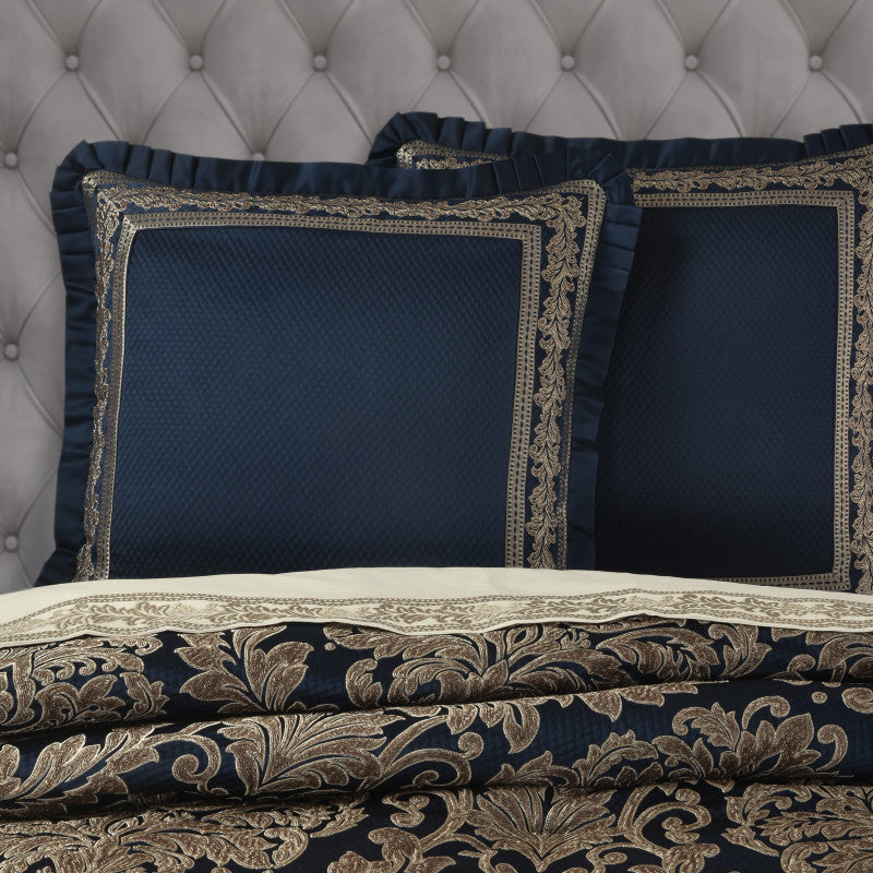 The Monte Carlo Euro sham features a deep navy blue satin matelassé framed with a metallic bronze scroll border to create a dramatic frame. Trimmed with a decorative flange that is pleated on all corners with a hidden zipper closure for a fine finish. This highly detailed Euro sham is made to coordinate with the Monte Carlo bed set for a complete look.