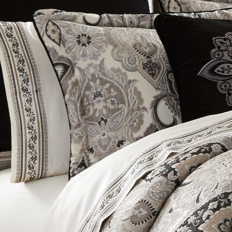The Guiliana 20 Inch Throw Pillow features an elegant woven jacquard medallion in silver, ivory, and black tones. The design is carefully centered and the reverse of the decorative pillow is constructed in a solid black velvet for versatility.
