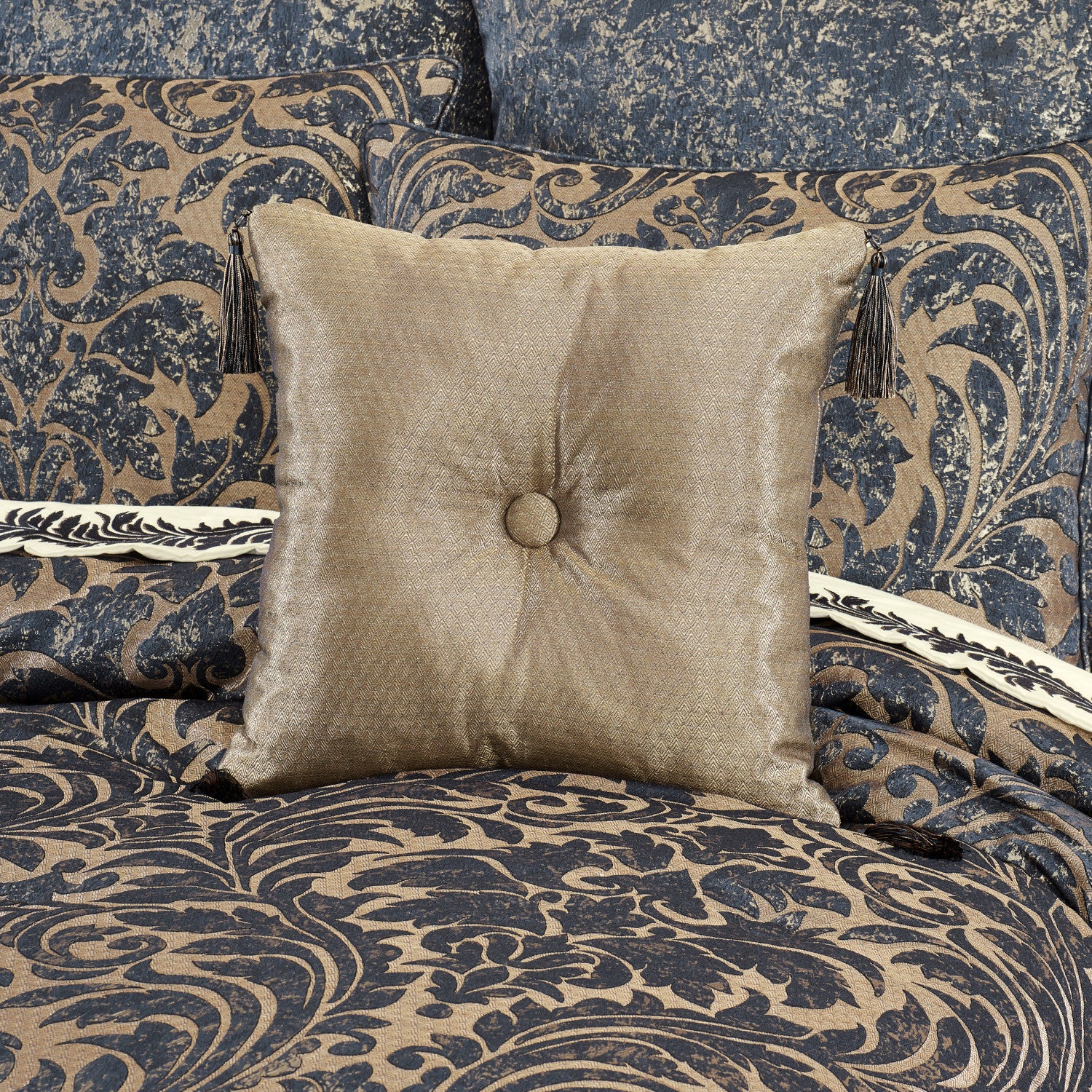 The Glimmerstone 18" Decorative Throw Pillow is exquisite with its use of shimmering gold tones. This beautiful square accent pillow is constructed with a deeply tufted button and is finished with a beautiful indigo tassel on all four sides. Pair this luxury accent pillow with the Glimmerstone bedding set for the complete look.