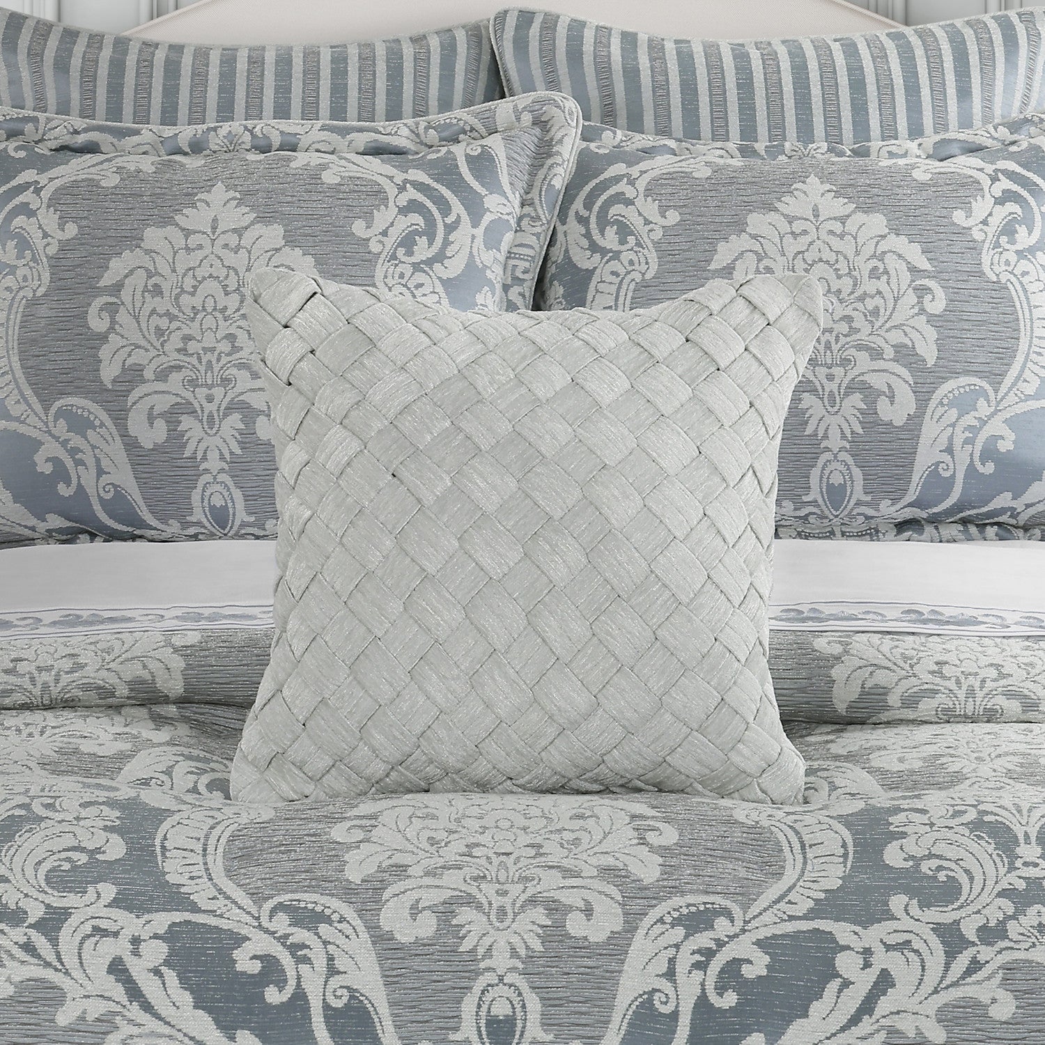 The Queensbury 18 Inch Throw Pillow features a stunning basketweave textured design in a soft ivory tone. This luxury traditional accent pillow was designed to coordinate with the Queensbury Bedding collection.