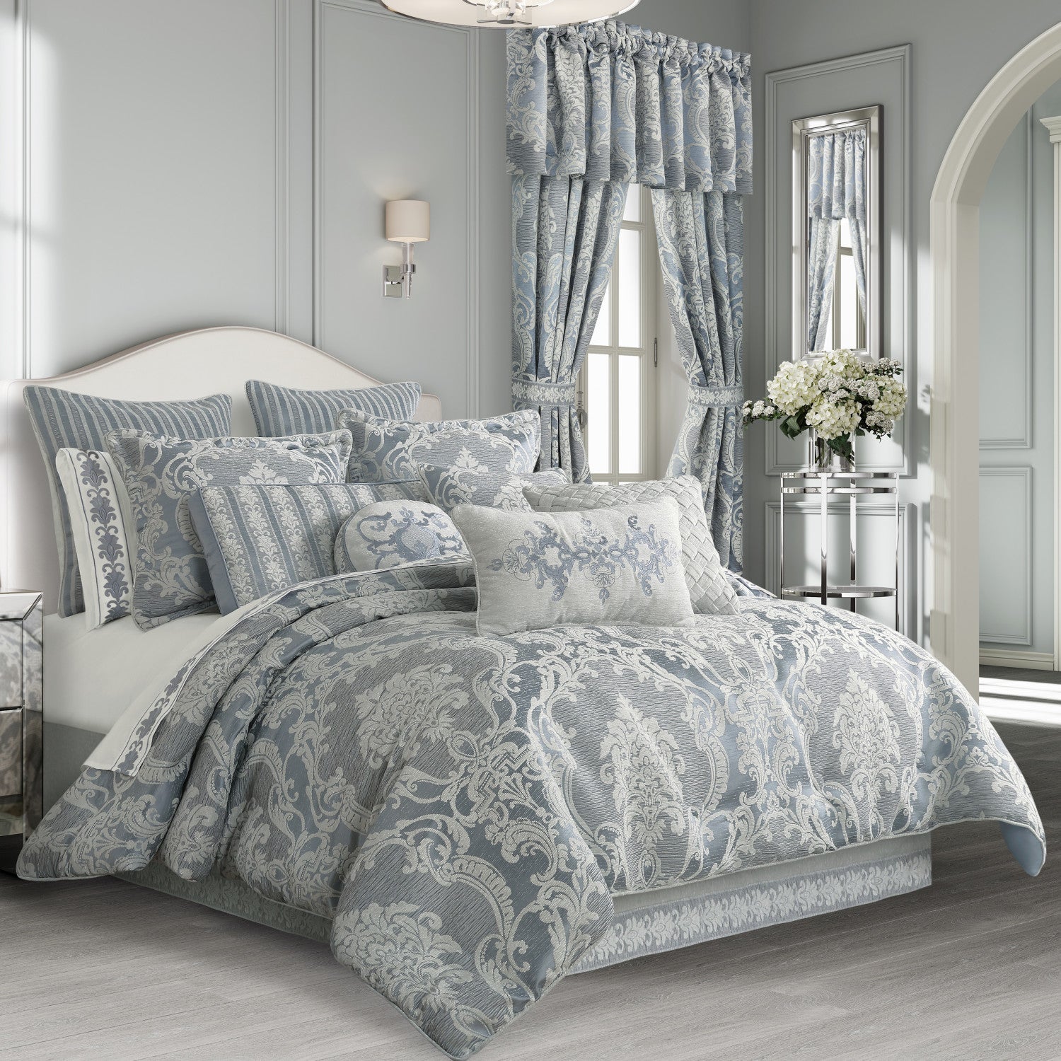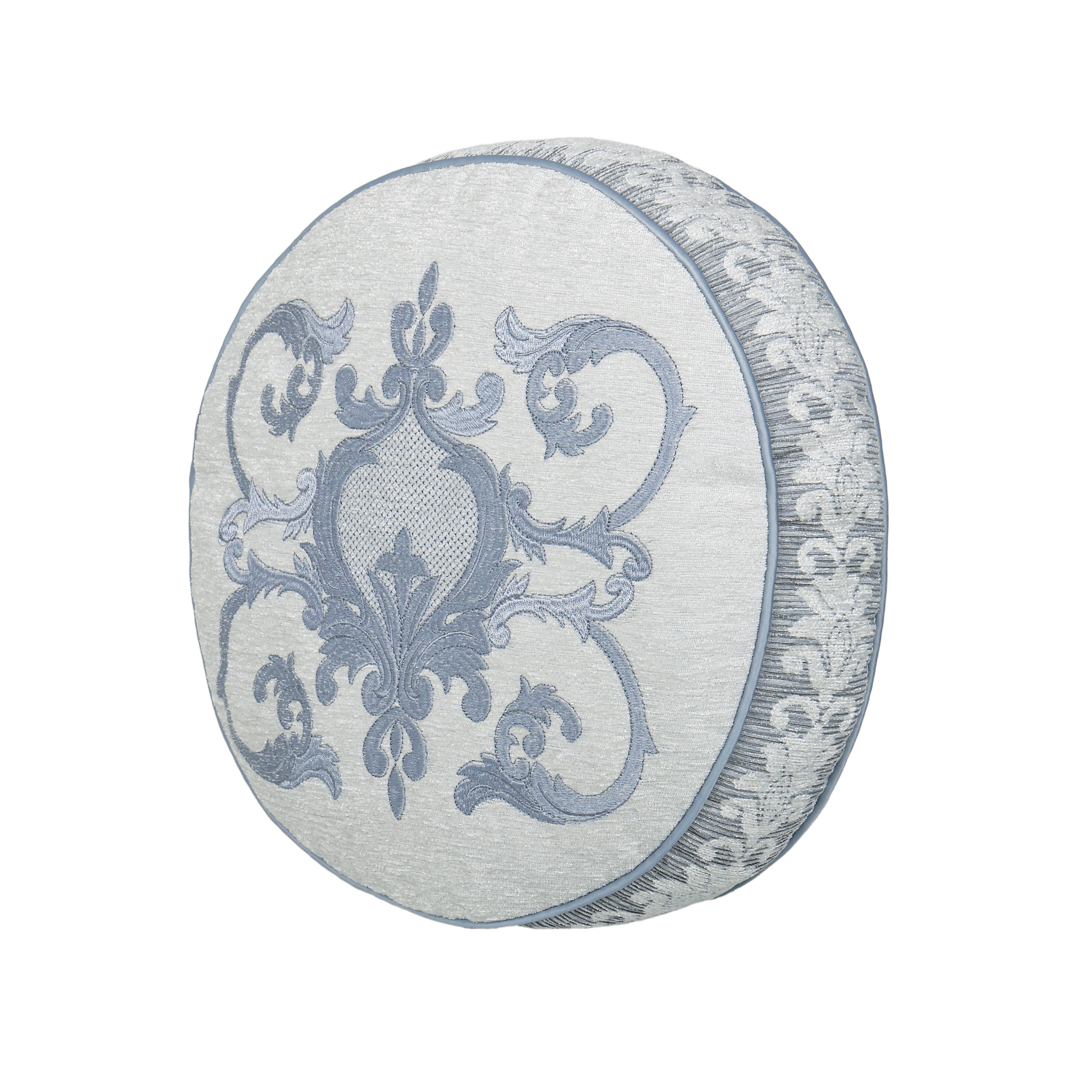 The Queensbury Round Pillow features a woven chenille fabric with a steel blue medallion embroidery to create a one of a kind accent to this bedding ensemble
