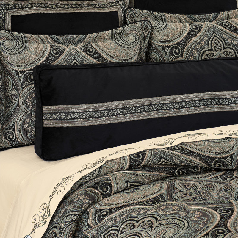 As seen in many luxury hotels, the Vincenzo reading bolster pillow adds elegance and a layer of full-coverage to the Vincenzo bedding collection. The Reading Bolster utilizes a horizontal woven stripe, reversing to an all-over woven damask, and the top and bottom are framed with a solid plush black velvet fabric. A 2.5 inch gusset on all sides and adds comforting loft and support. This luxurious accent pillow is recommended to add as the finishing touch to the Vincenzo bedding set.