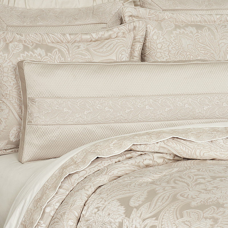 The Villanova reading bolster adds an element of full layer coverage and dimension to the collection. The oversized accent pillow spans the width of the bed and is perfect for propping up when reading. It is a reversible pillow, featuring a soft champagne woven Jacobean horizontal band. Created with a 2 ½” gusset for added loft and support and it is finished with delicate soft satin piping.