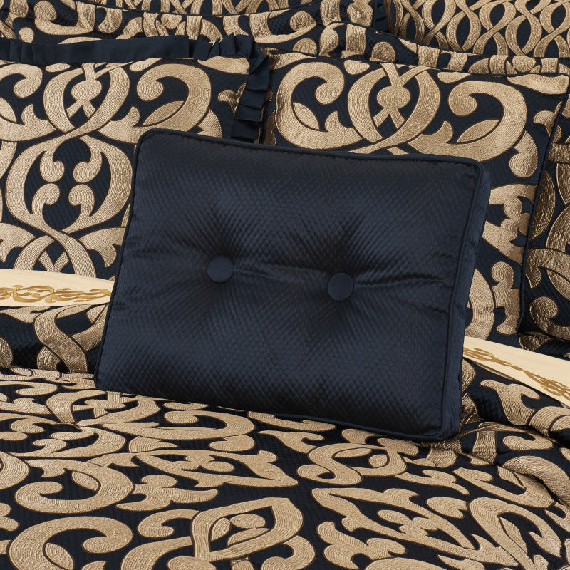 La almohada Boudoir Biagio añade un toque tonal al conjunto con su moderno diseño con fuelle. Esta almohada rectangular está confeccionada con una lujosa tela matelassé azul marino, rematada con dos botones de satén en el centro y combina a la perfección con el lujoso juego de cama Biagio.