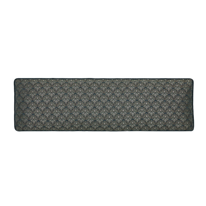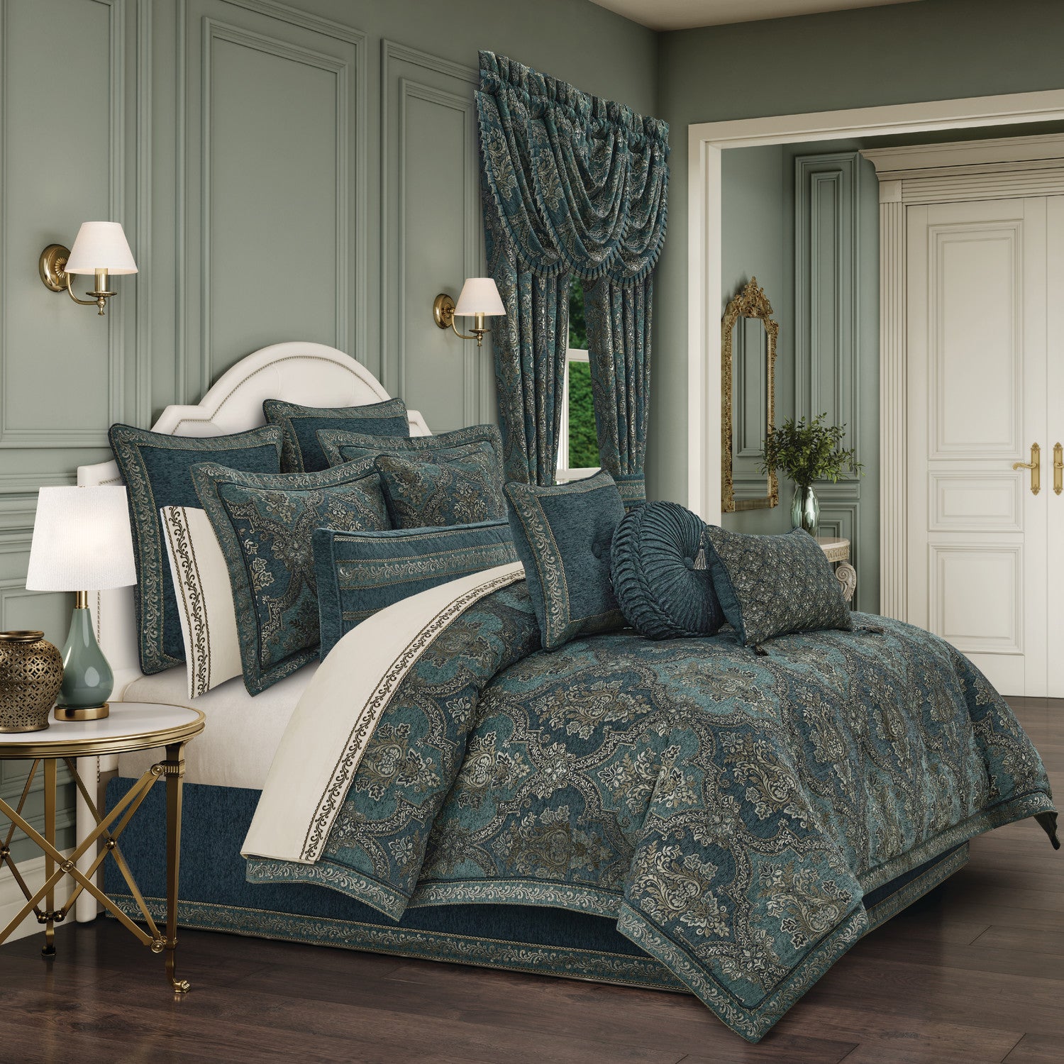 Effortless elegance and timeless colors inspire the Nancy Bolster Throw Pillow. It features a stunning woven chenille stripe in a teal, green, and gold colorway, with a coordinating woven foulard pattern on the reverse. This luxurious gusseted accent pillow is recommended to add as a full-length layer to the Nancy bedding set.