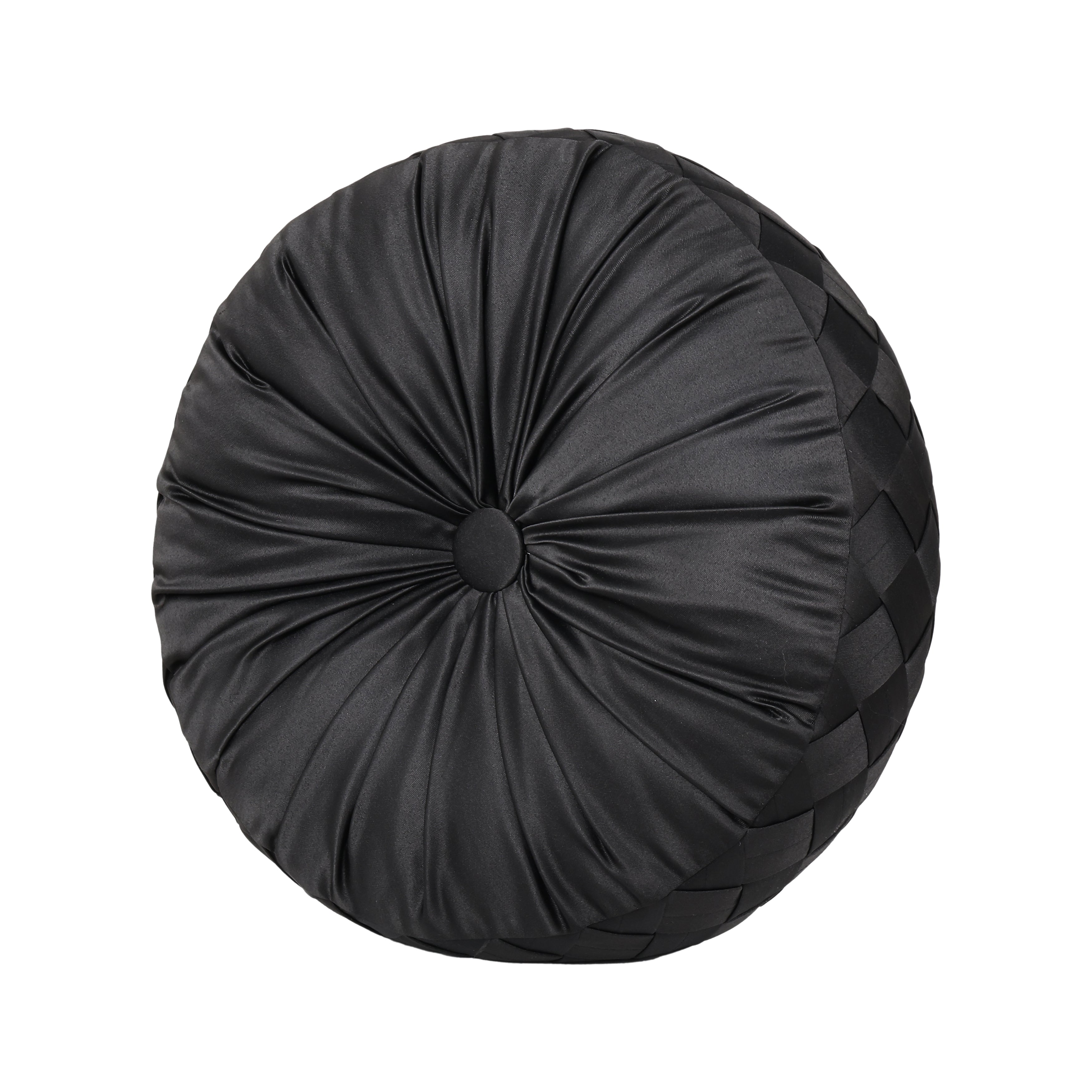 The Harriman Tufted Round Pillow uses a beautiful plush black satin fabric to create a one of kind accent to this bedding ensemble. This 15" unique round accent pillow is sewn by hand and is finished with a fabric covered button on both sides. Pair it with the Harriman bedding set by Five Queens Court for a complete look.