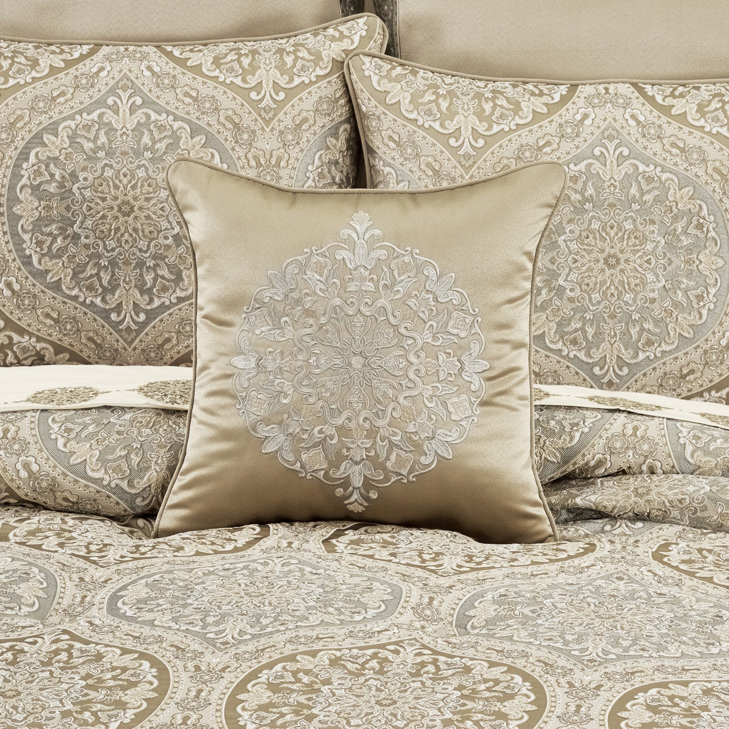 The Romero 18" Square Decorative Embroidered Throw Pillow is redefines luxurious accent pieces. It features a highly detailed medallion embroidery design in a stunning gold and pearl colorway. Pair this throw pillow with the Romero Bedding set for a complete traditional look.