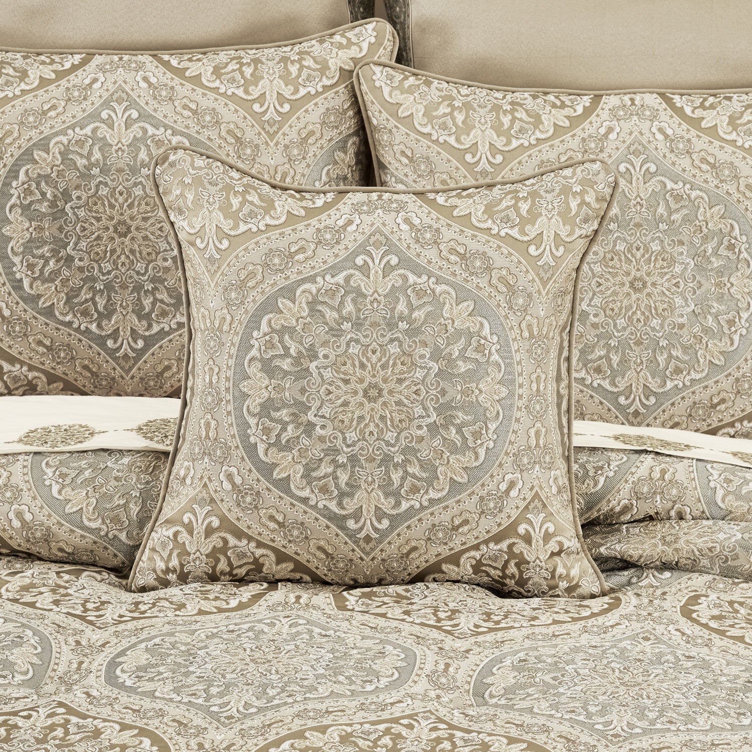 The Romero 20" Square Decorative Pillow is truly luxurious and offers endless elegance. It features an intricate woven medallion in shades of pearl, white and glimmering golds, and it reverses to a woven medallion stripe, allowing you to change up your style. Pair this pillow with the Romero Bedding set for a complete traditional look.