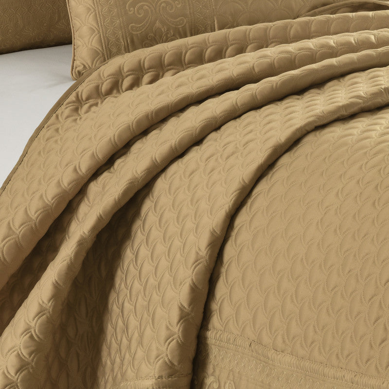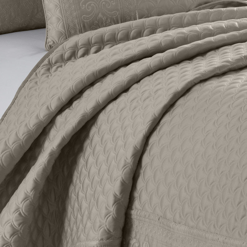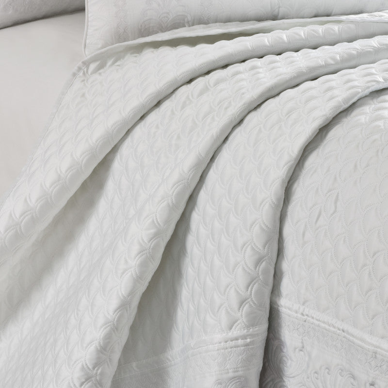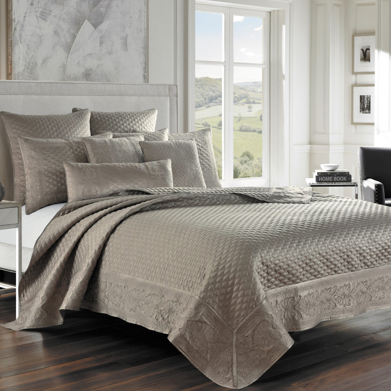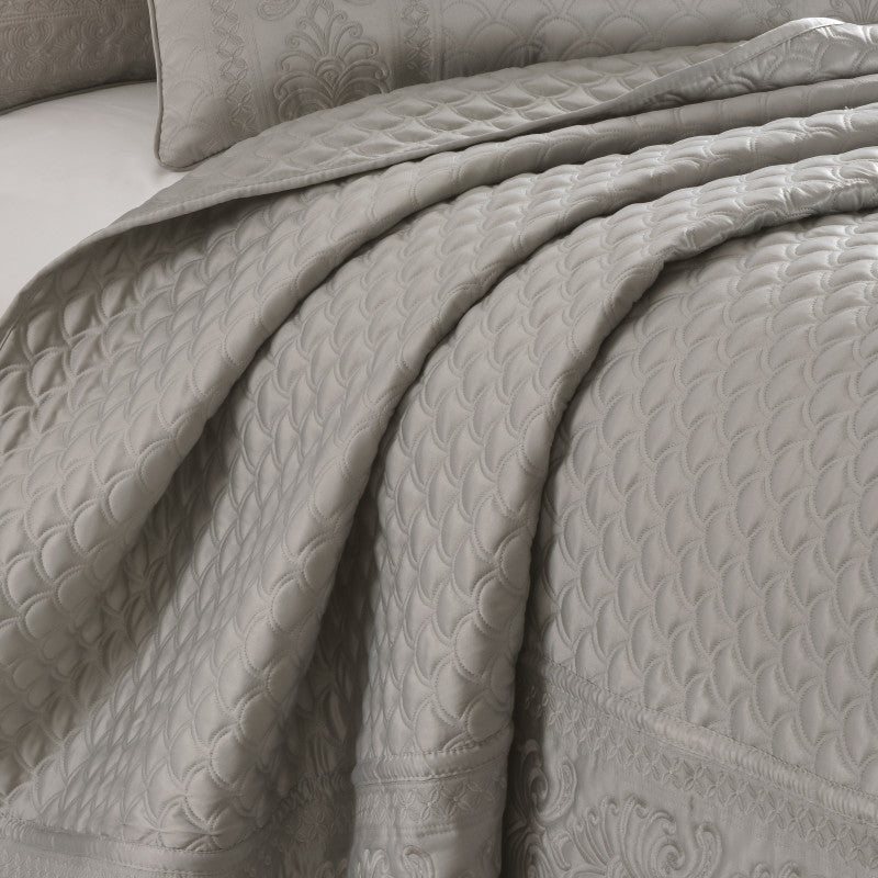 Dale un toque de lujo a tu dormitorio con una versión actualizada de una colcha/colcha tradicional atemporal. La tela afelpada tiene un acabado de satén mate que añade un ligero brillo y dimensión a la decoración de tu dormitorio. Disponible en una variedad de colores de moda, este diseño acolchado a máquina está ribeteado con un elegante fular y bordado damasco, con esquinas en inglete y ribeteado del mismo color. Añade las fundas y cojines a juego para completar el elegante look.
