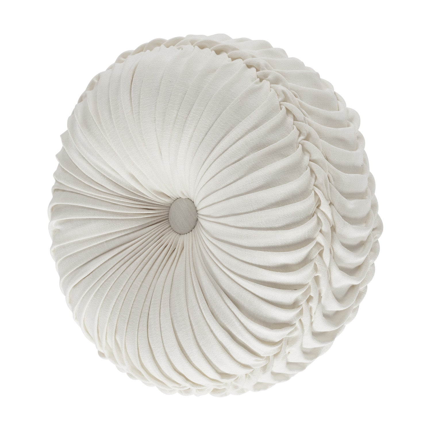 The tufted round pillow uses white colored faux linen to create a one of a kind accent to this bedding ensemble. These unique pillows are sewn by hand and are finished with a fabric-covered button on both sides.