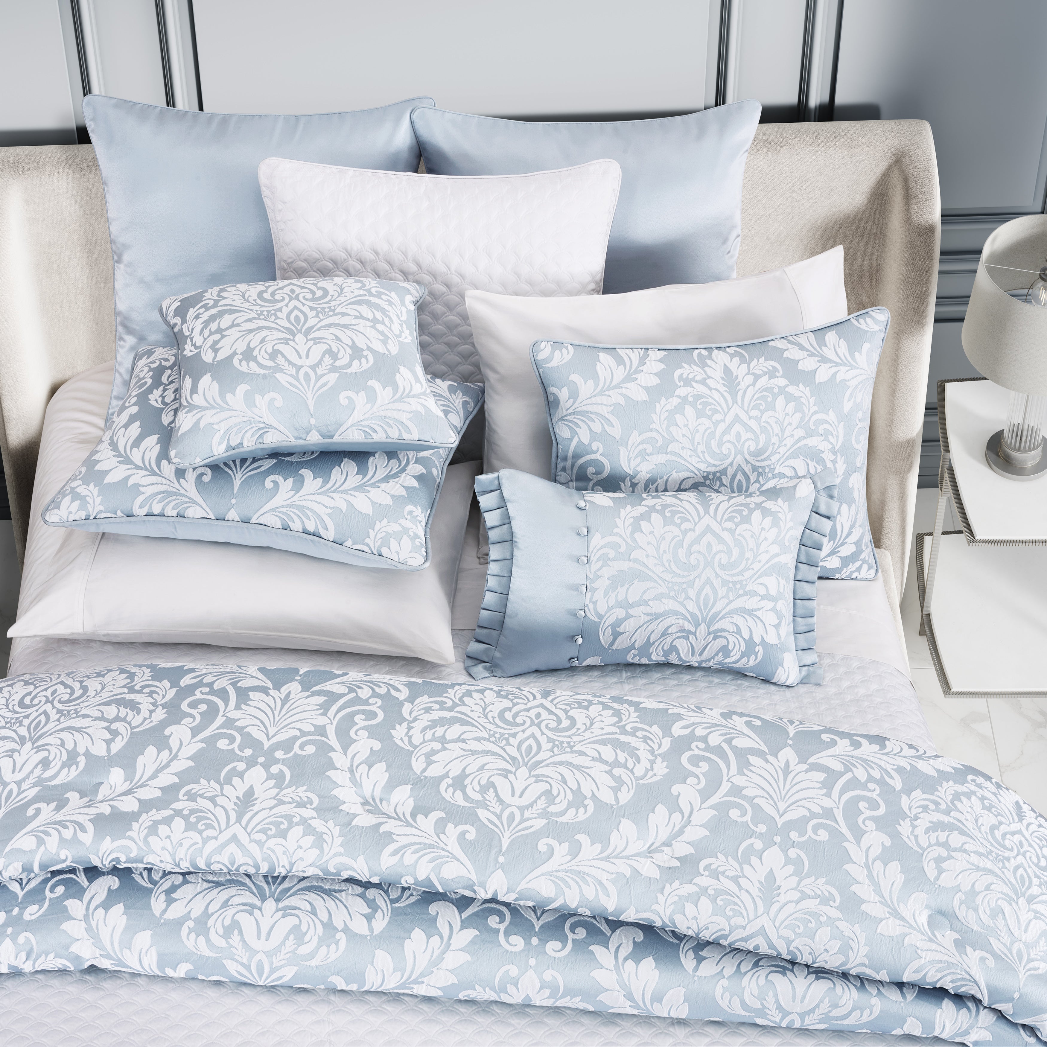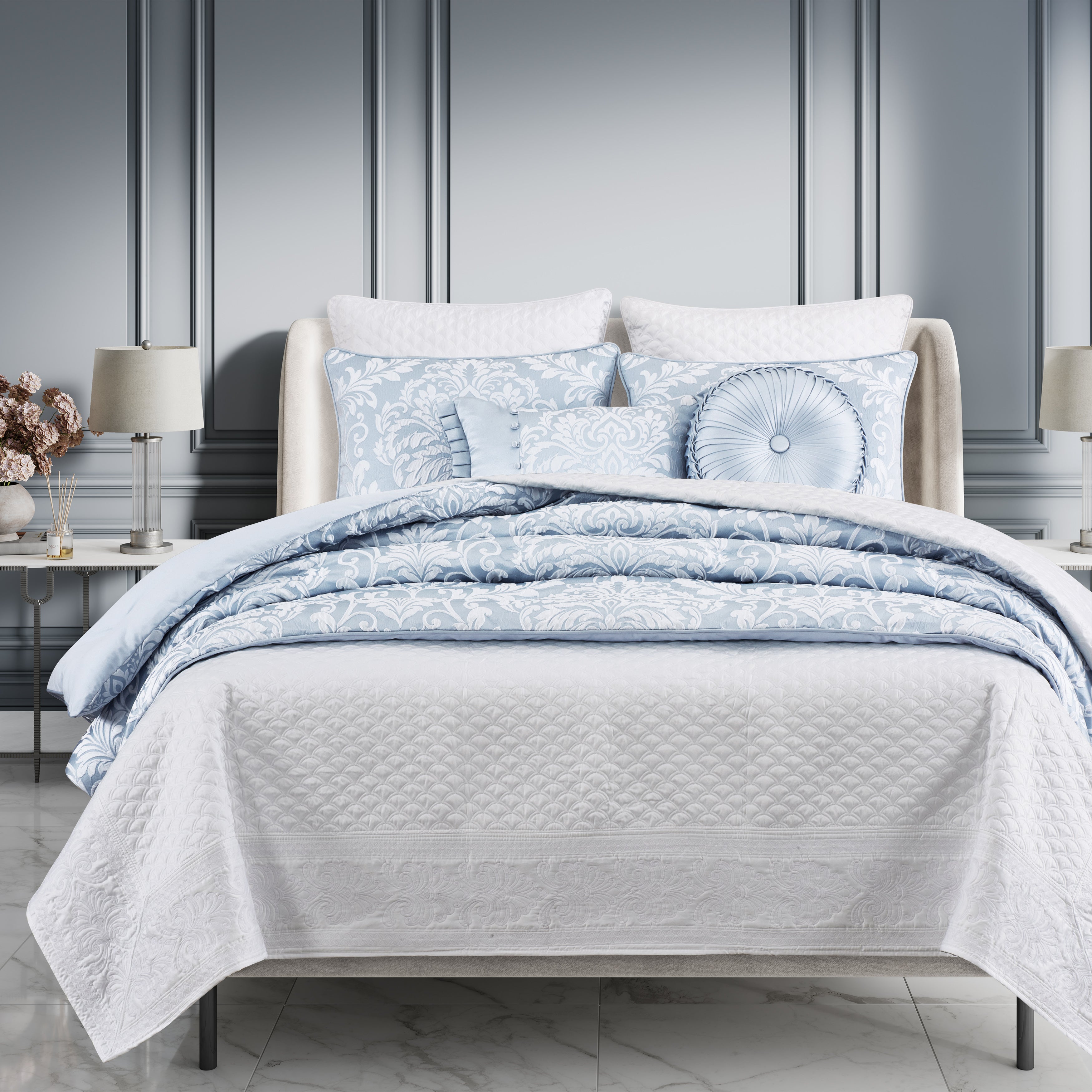 Crea la habitación de tus sueños con el lujoso juego de edredón Malita de 4 piezas. El edredón destaca un diseño damasco blanco plateado sobre un precioso azul pálido, tejido para crear un efecto 3D. La tela del reverso y el faldón están confeccionados en un azul pálido liso a juego. La atención al detalle garantiza que cada edredón se corte en el mismo punto para garantizar que todos sean iguales. Las fundas de almohada tienen el mismo corte, centrando el magnífico diseño damasco.