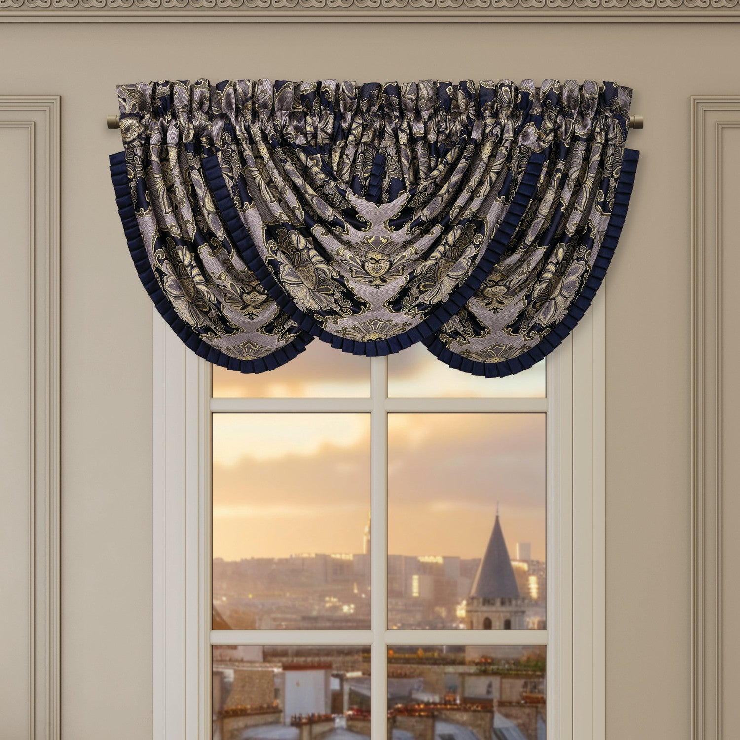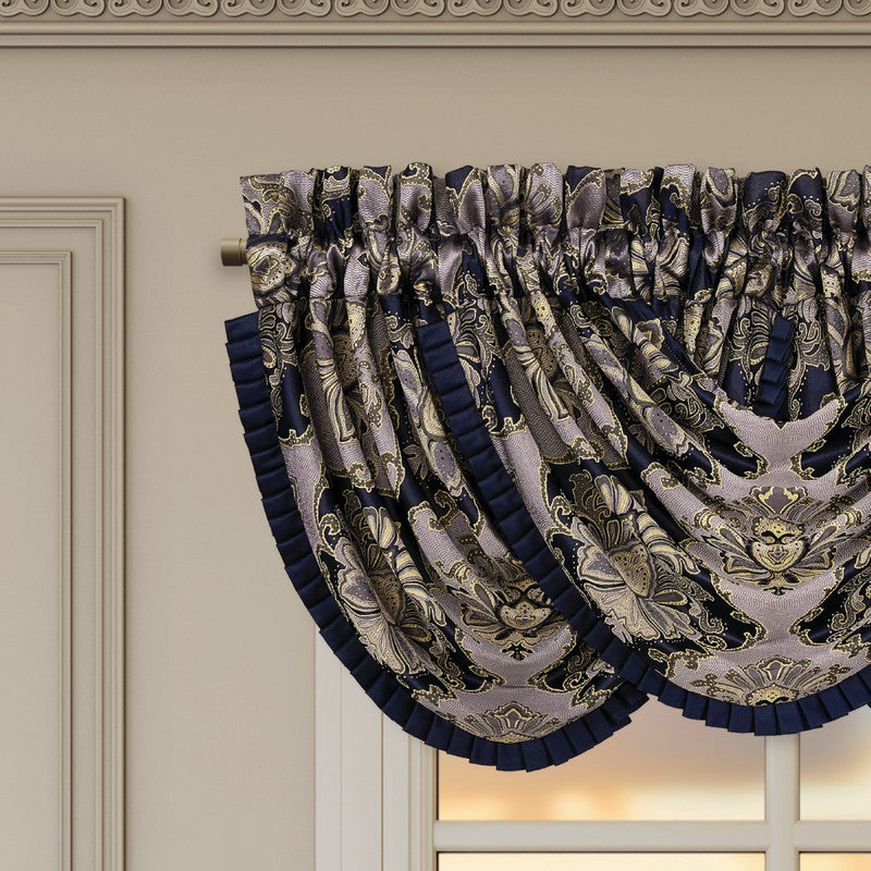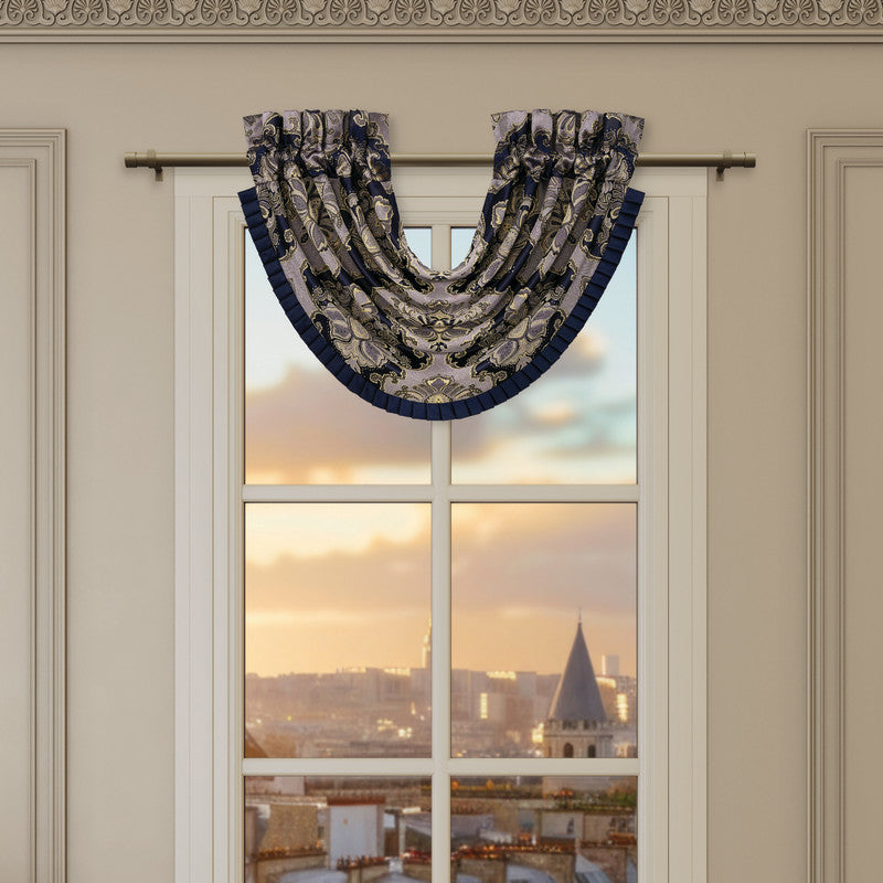 The Bradley Waterfall Valance brings an air of timeless romance to any room, its ornate damask design unfurling in deep navy blue and shimmering gold tones. Expertly woven, the fabric reveals rich, intricate detailing, beautifully framed by an elegant pleated flange trim. Designed for effortless styling, the valance features a 3" header and 3" rod pocket for easy hanging. For the full, cascading look shown, three valances are used (each sold separately).
