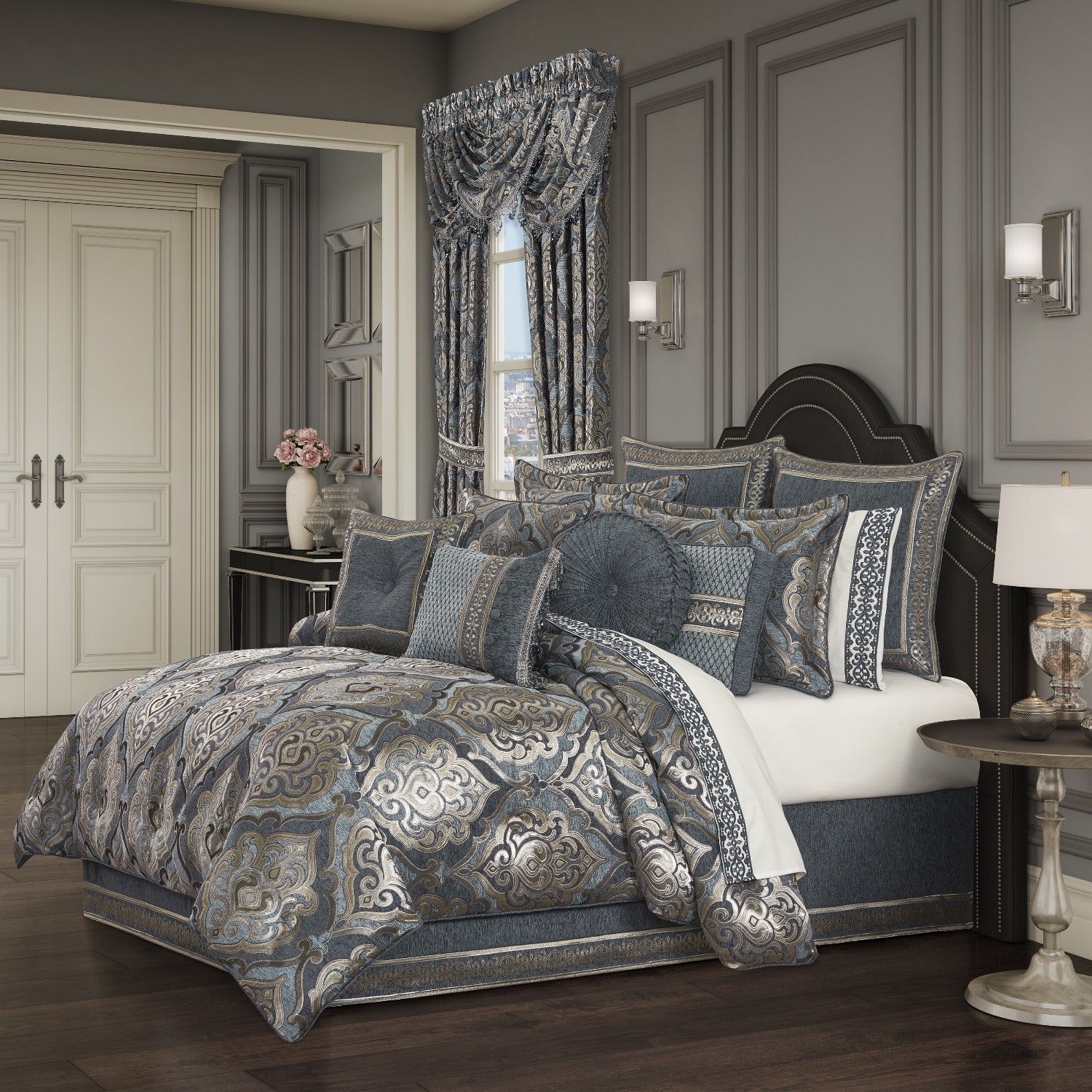 Enjoy the bedding of your dreams and take it to a luxurious taste level with the Amici 4 Piece Comforter Set. Constructed with a highly detailed woven iron-gate damask in gorgeous tones of powder blue, silver, and gold, which create a unique subtle glow that boasts many decorator details. This stunning oversized and overfilled comforter is truly one that will give you lasting comfort and an array of compliments. Paired with matching shams and a split-corner tailored bedskirt that pulls the beauty all together. Pair this bedding collection with the Amici throw pillows, shams, and window treatments for a complete look.