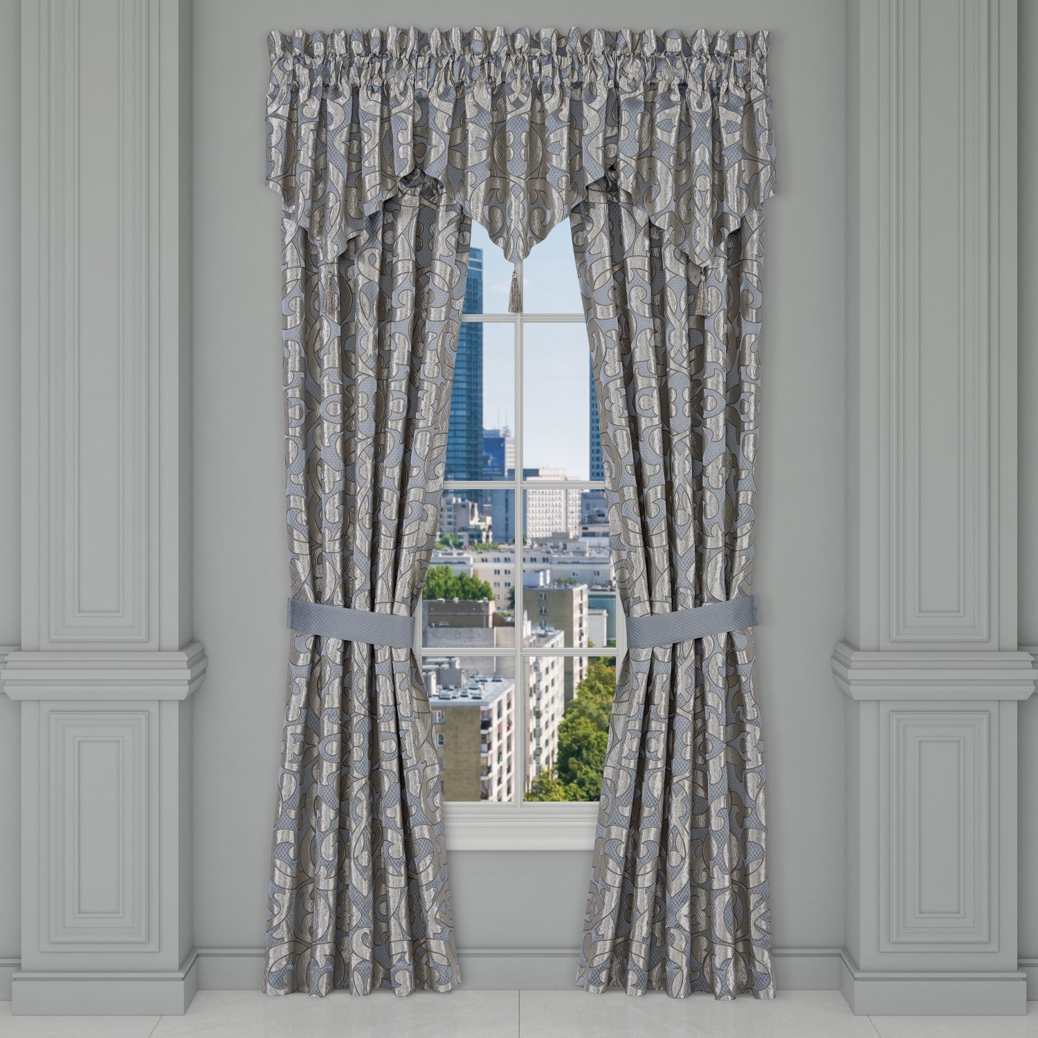 The Barocco Window Panel Pair is exquisite with its fine details and sophisticated use of soft powder blue hues and sterling silver. An interlocking scroll damask, woven on a subtle background, with a unique fabrication process, giving the appearance of an appliqued technique to the grand scale design. The panels are lined for room darkening privacy, include tiebacks, and the 3" header and 3" rod pocket make these panels easy to hang. Pair these panels with the Barocco bedding set by J. Queen New York for a complete look.