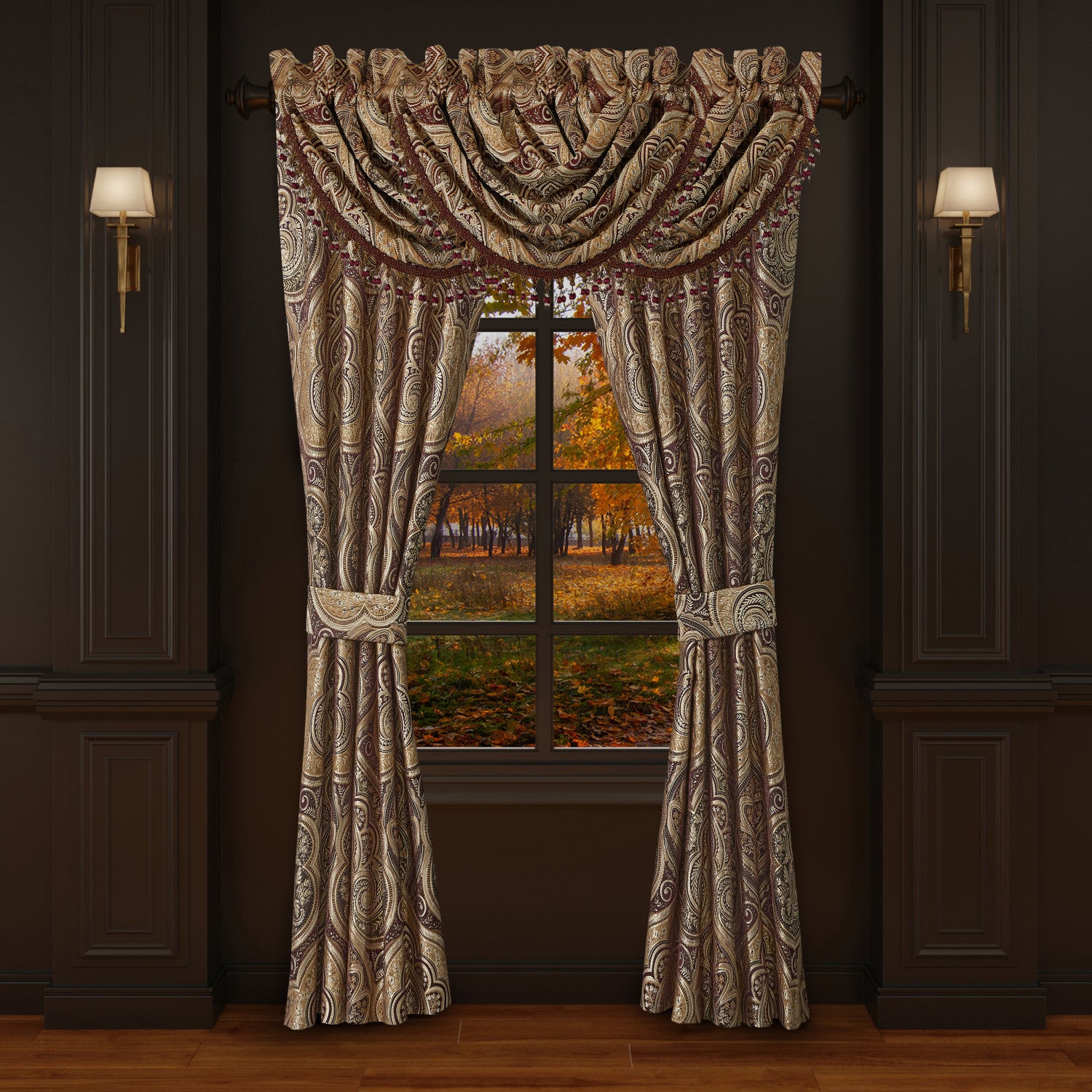 The Bordeaux Window Valance is constructed with a highly detailed traditional woven damask design in shades of crimson, chocolate, and shimmery golden hues. Fully lined to provide darkness for comfortable sleep and relaxation. Each valance is engineered to be exactly the same and they are finished with a multi-colored dyed to match tassel fringe with elegant crystals for a touch of glam. Designed to coordinate with the Bordeaux window panels to complete your bedroom windows. To achieve the look in the photo we recommend 3 valances (each sold separately).