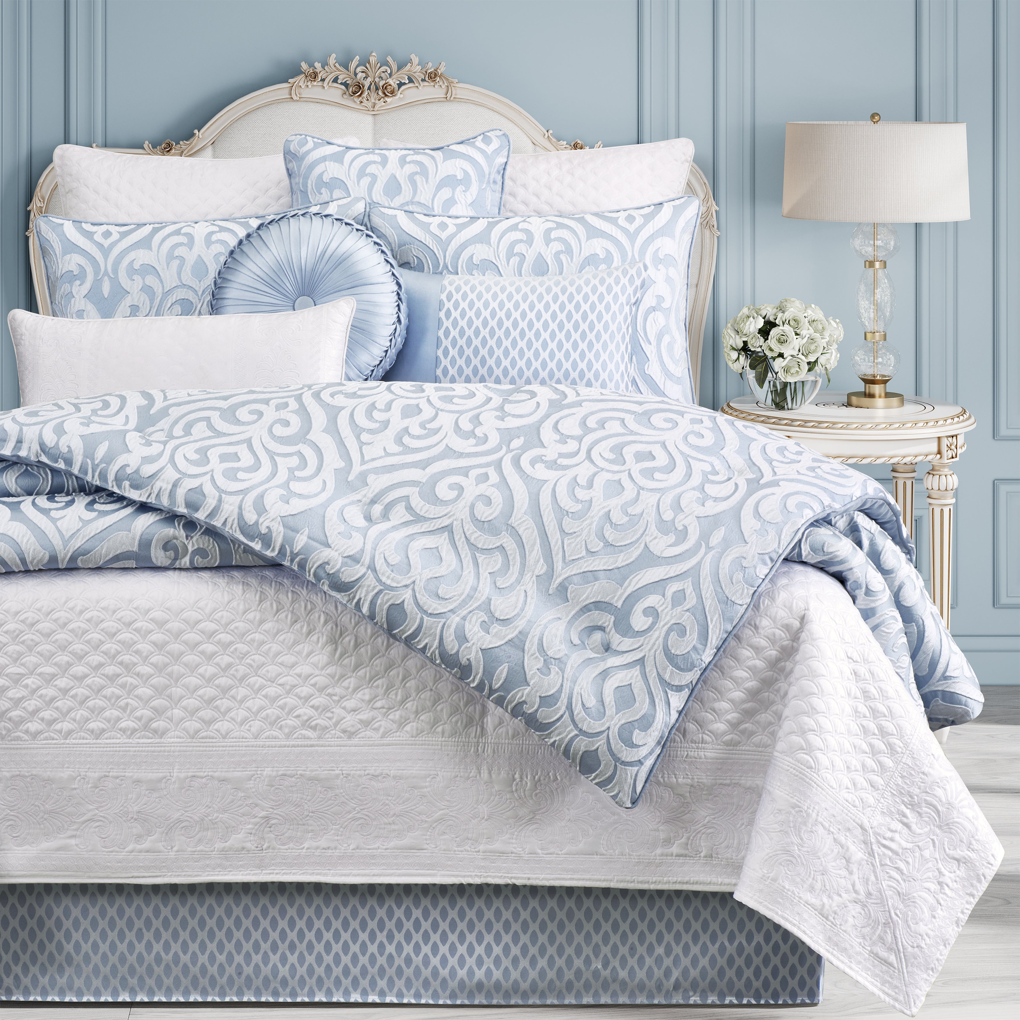 The Liana 4 Piece Comforter Set Bedding Collection is exquisite with its ornate, large scale design and sophisticated use of powder blue colors. This beautiful woven puff damask pattern is rich with its 3-dimensional weave and luxurious satin finish. Paired with matching hidden zipper pillow shams and a lovely woven puff lattice split-corner tailored bedskirt in matching colors, this oversized ensemble will add updated elegance to your bedroom decor. The reverse of this set features a plush microfiber dyed to match the powder blue base fabric and is finished with satin piping.