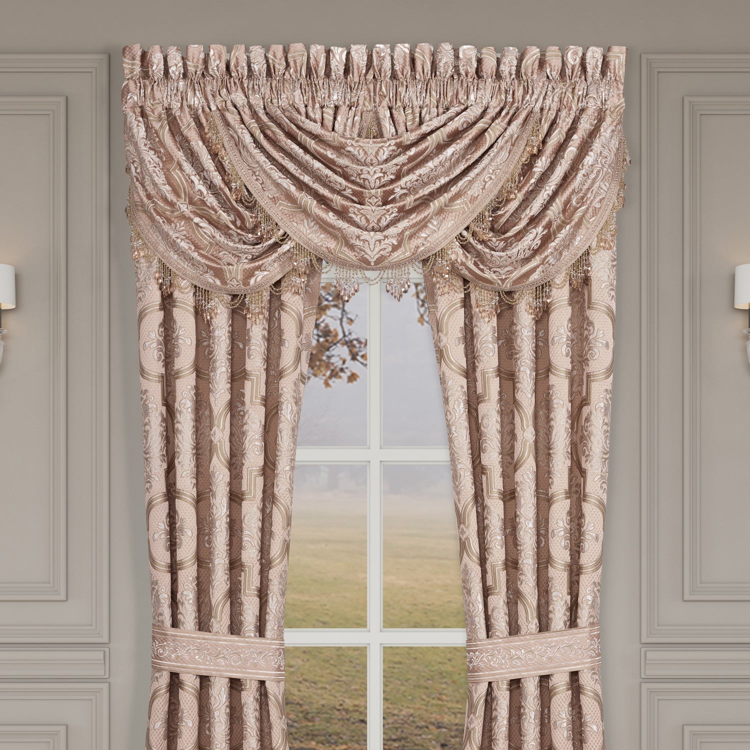 Create a custom look on your window with this elegant waterfall valance made with a stunning woven jacquard damask in soft blush, white and gold hues. The lined valance is trimmed with a luxurious tear drop crystal tassel fringe, dyed to match the blush and rose golds in the Rosewater comforter set and window panels. In order to achieve the look in the photo, we suggest using three valances (each sold separately).